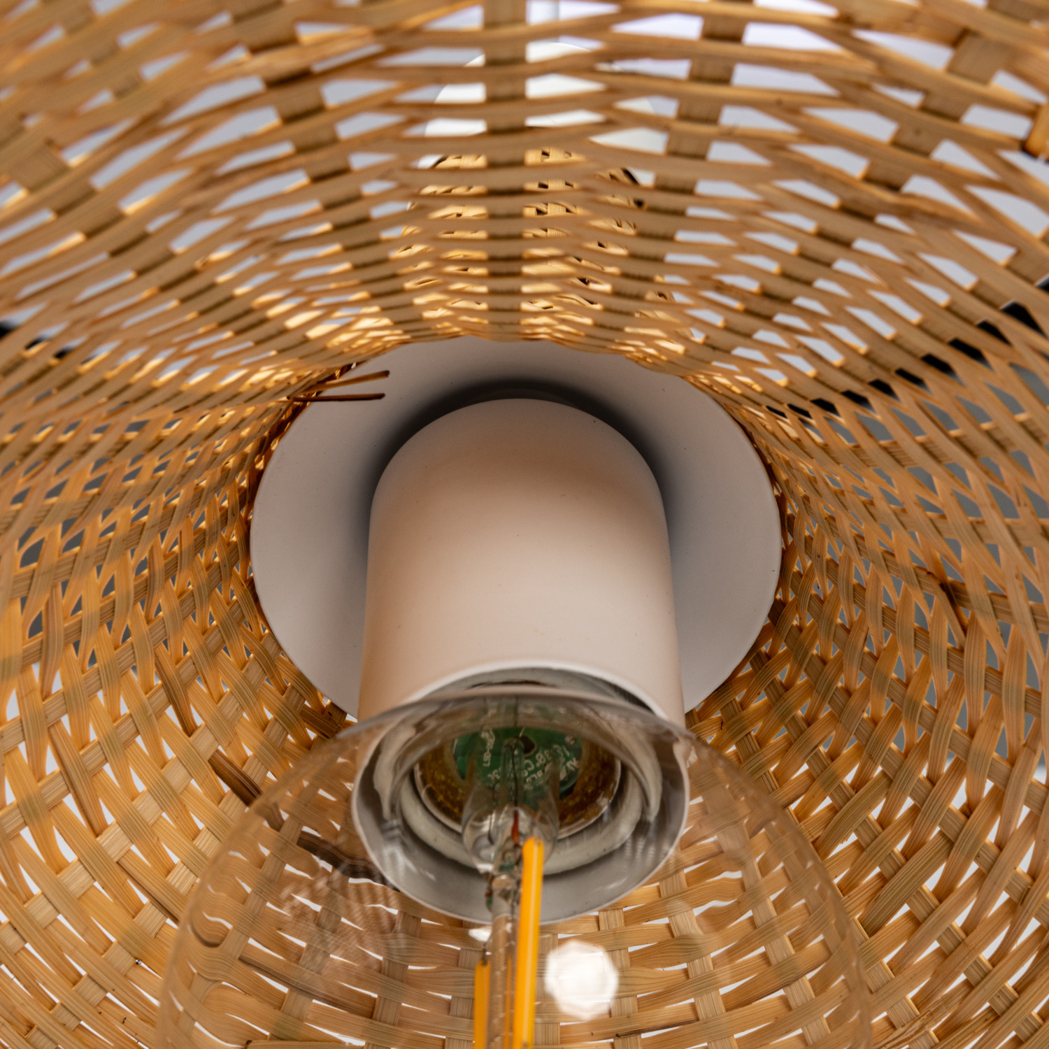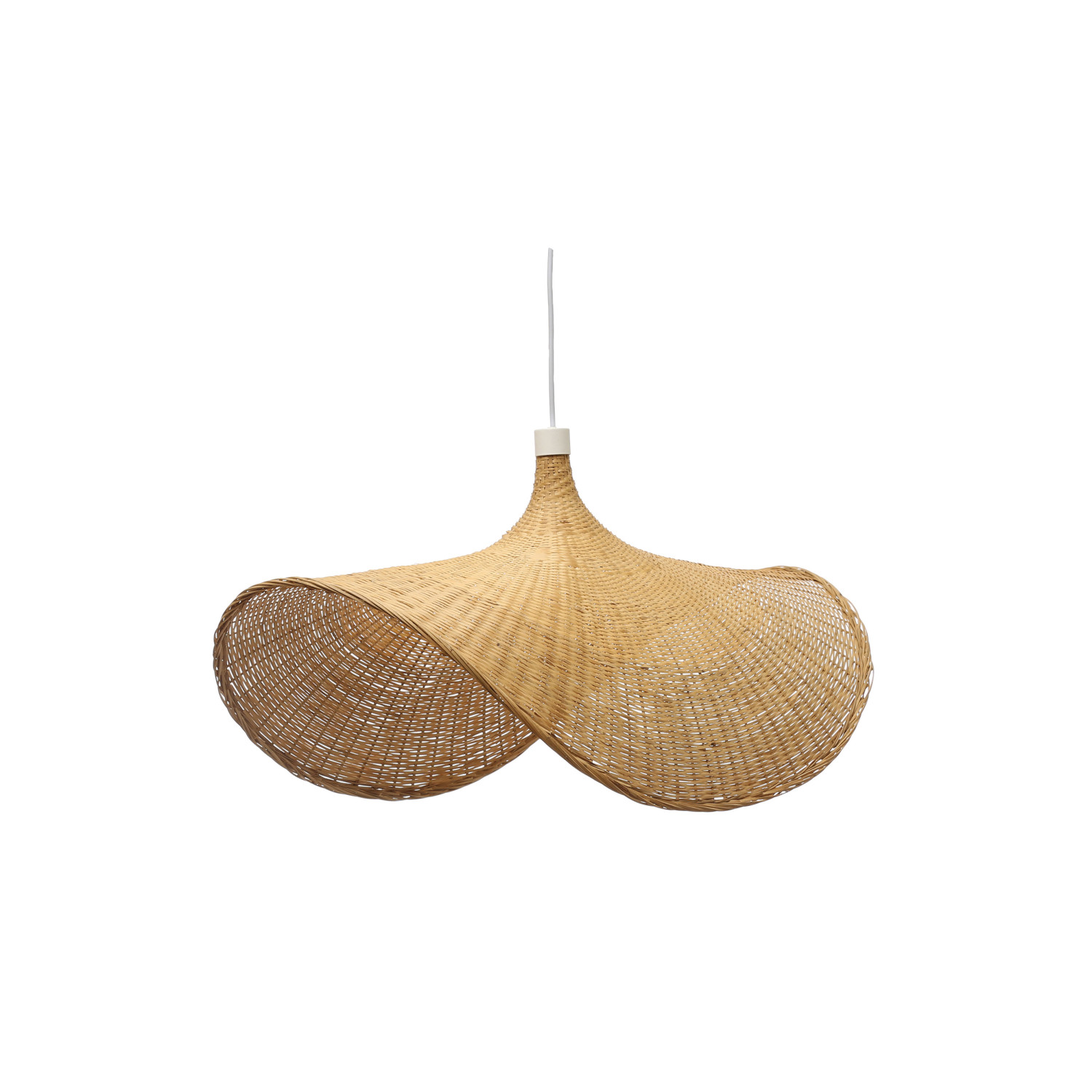 The selection of pendant, flush, chandelier, and ceiling lamps offers style and elegance for any space. The lamps have different shapes, sizes, colors, and materials to match any decor. The lamps create different effects, from focal points to cozy ambiances to dazzling displays for rustic, farmhouse, modern, or contemporary designs. The lamps are easy to install and maintain and provide high-quality lighting for a long time. The collection has modern, minimalist, classic, and ornate lamps for any room. The perfect lighting solution is waiting in the collection of pendants, flush, chandeliers, and ceiling lamps. Don't miss this opportunity to transform every space with these stunning lamps. This natural bamboo pendant lamp features a fan-shaped design that adds a touch of tropical flair to any space. Whether placed in any foyer, dining room, or living area, it will set the mood for welcoming guests. Requires hardwiring and comes with a six-foot cord. 60-watt maximum bulb required (sold separately).
