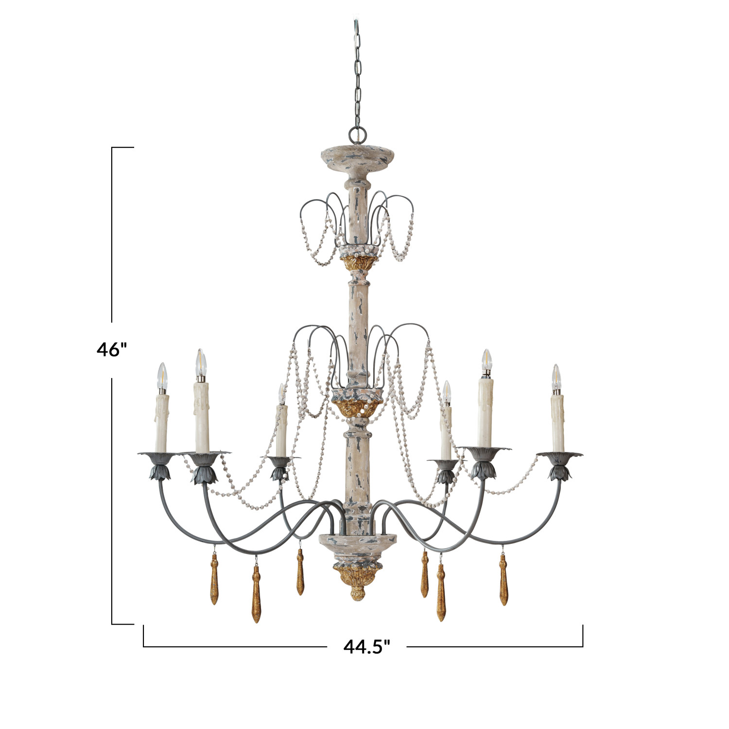 Catalog Name: 44-1/2" Round x 46"H Rubberwood, Metal & Resin Chandelier w/ Wood Beads/Drops & 6 Lights, 8' Chain & 6' Cord, Distressed Finish, Black, White & Gold Finish, Truck Ship (Hardwire Only)