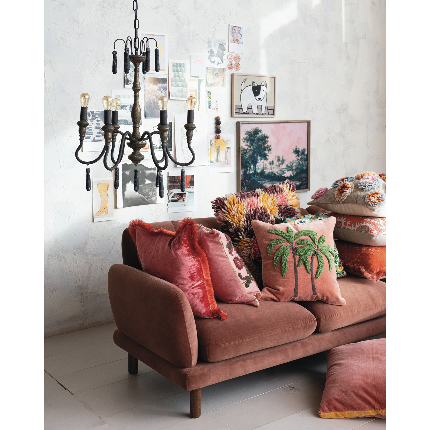 This Metal Pendant Lamp with Wood Drops is a statement piece that captivates with its distressed finish in black and gold colors. The charcoal-colored canopy, measuring 4.75 inches round, complements the lamp's overall aesthetic. It requires 6 E12 bulbs to illuminate any space with a soft, inviting light. The lamp's dimensions, along with a 5.5-foot chain and a 9-foot cord, offer versatility in installation and placement. Whether it's hung in a dining area or a cozy reading nook, this pendant lamp adds a touch of sophistication and a hint of nostalgia to the home decor. The combination of metal and wood elements creates a unique contrast that adds character to any room. The adjustable chain and cord length make it easy to customize the lamp's height to suit every space perfectly.