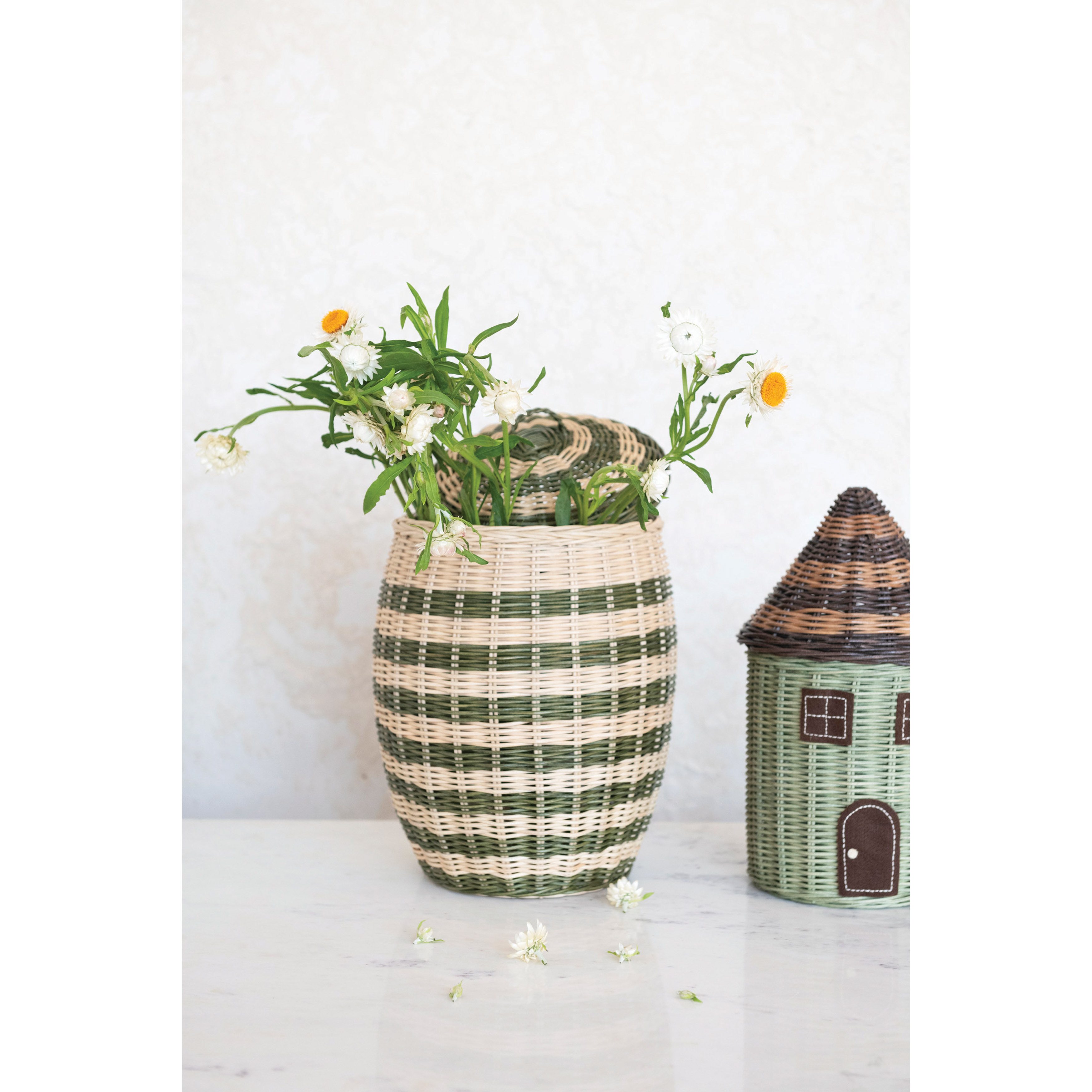 Hand-Woven Rattan Striped Basket with Lid