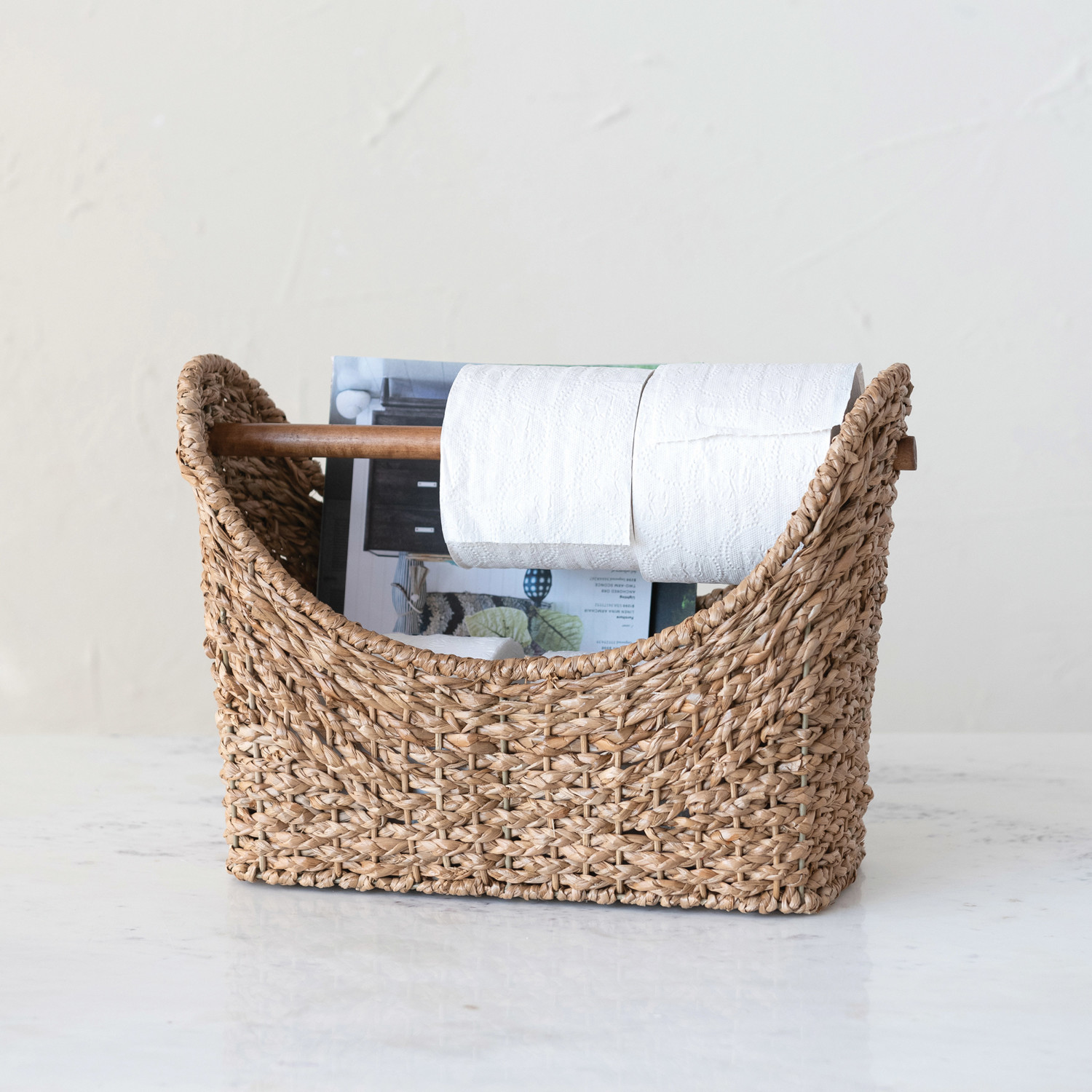 This striking toilet paper basket showcases masterfully handwoven bankuan adorned with a wood handle.