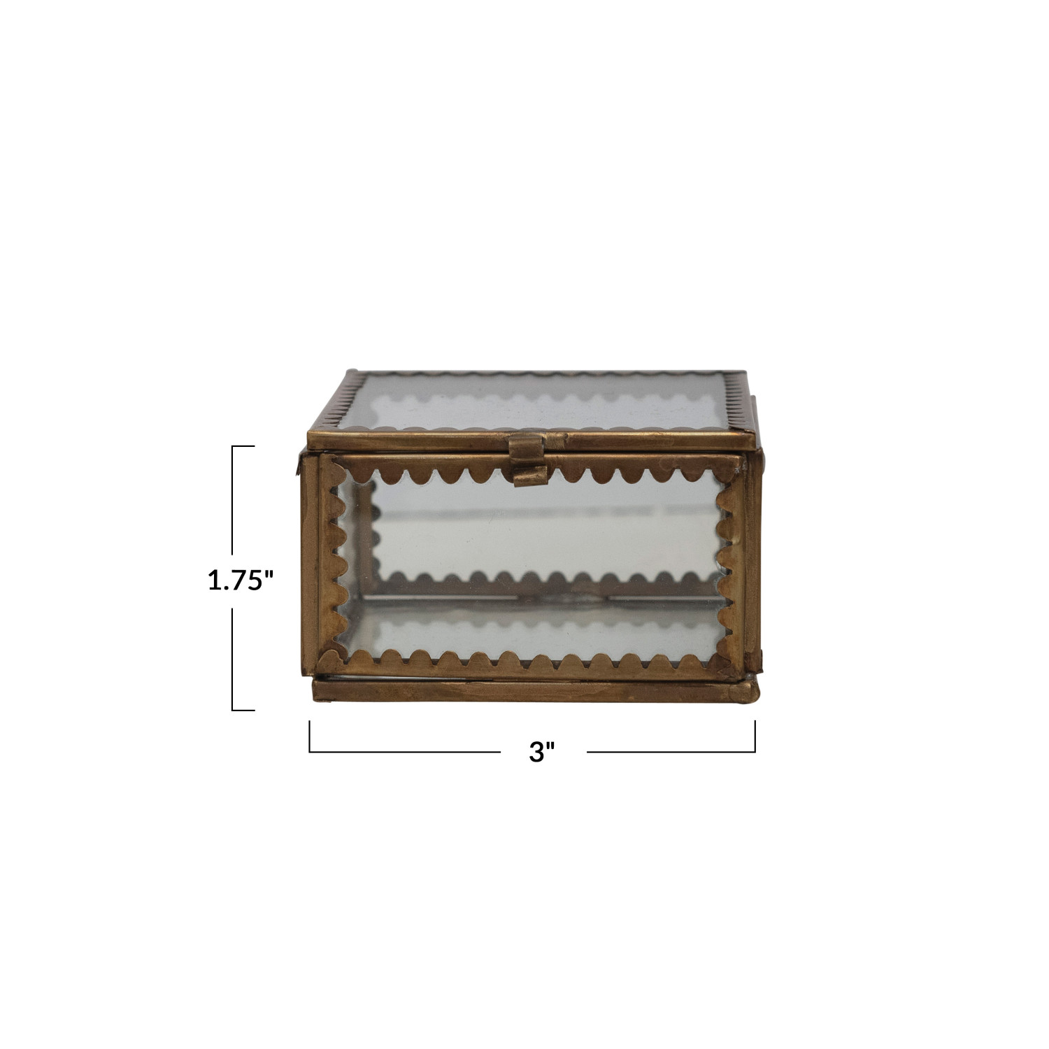 This brass and glass display box with scalloped edges and antique finish is a beautiful piece that will enhance any home décor. This display box has a unique design and an eye-catching vintage charm. The box is made of high-quality brass with an antique finish on the frame and the hinges. The box has clear glass panels on all sides that allow anyone to see the contents inside. The box has scalloped edges that add flair and detail to the piece. This display box is a lovely piece that can store and display small items such as rings, earrings, charms, or crystals. This display box can be placed on a nightstand, dresser, vanity, or shelf to add elegance and beauty to any space. This display box can complement any Victorian, shabby chic, or French country-style home décor with its ornate, romantic, and rustic vibe. This display box is perfect for any space, measuring 3 inches square and 1.75 inches high. Order this today and enjoy a stylish and practical addition to any home. Display precious items with this brass and glass display box with scalloped edges and antique finish that features a unique design and a vintage charm. This display box is a wonderful choice for Victorian, shabby chic, or French country style home décor, as it reflects the ornate, romantic, and rustic elements in these themes. This display box is a lovely piece that can be used to store and display small items such as rings, earrings, charms, or crystals. This is made of high-quality brass and glass that reflects the beauty and style of the home décor.