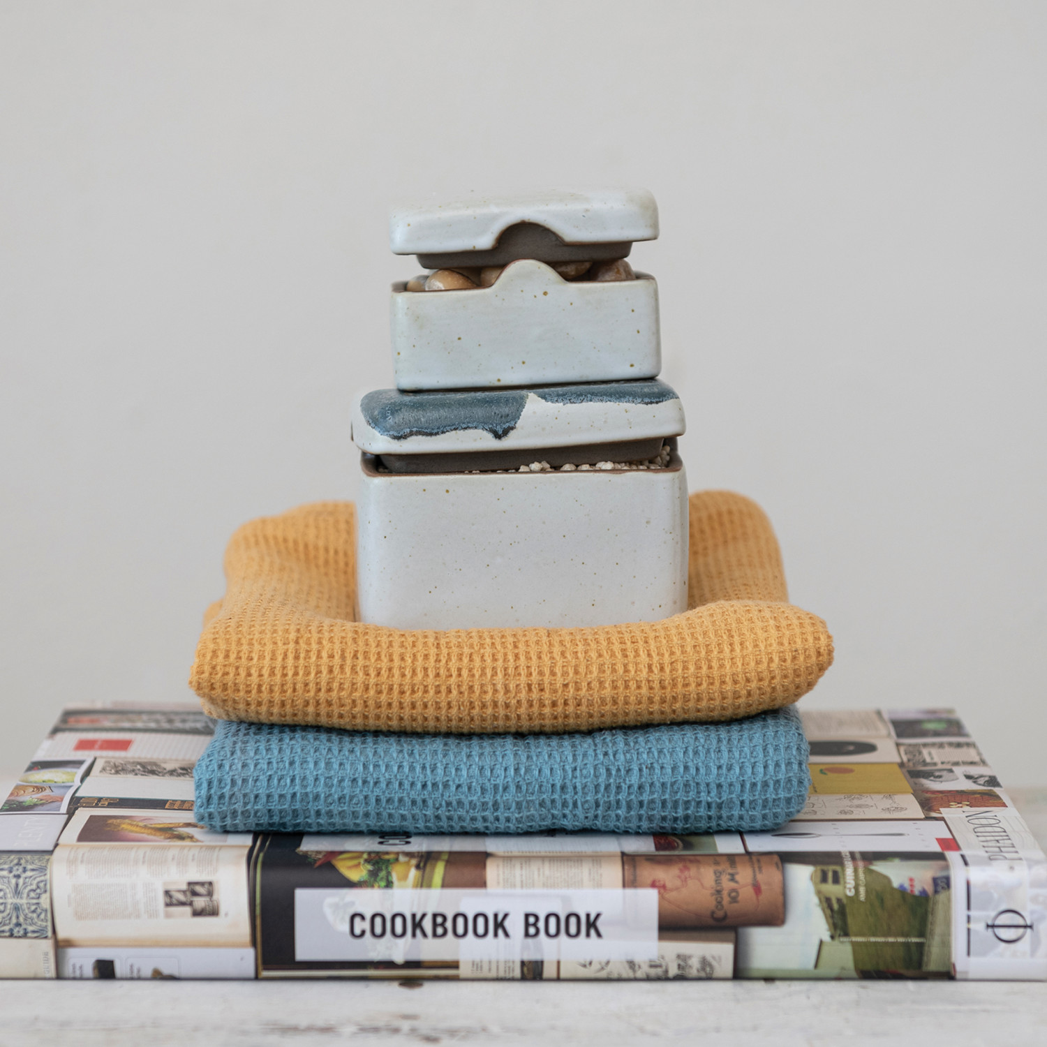 Catalog Name: 3-3/4" Square x 2-3/4"H Hand-Painted Stoneware Box w/ Lid, Reactive Glaze, White & Black (Each One Will Vary)
