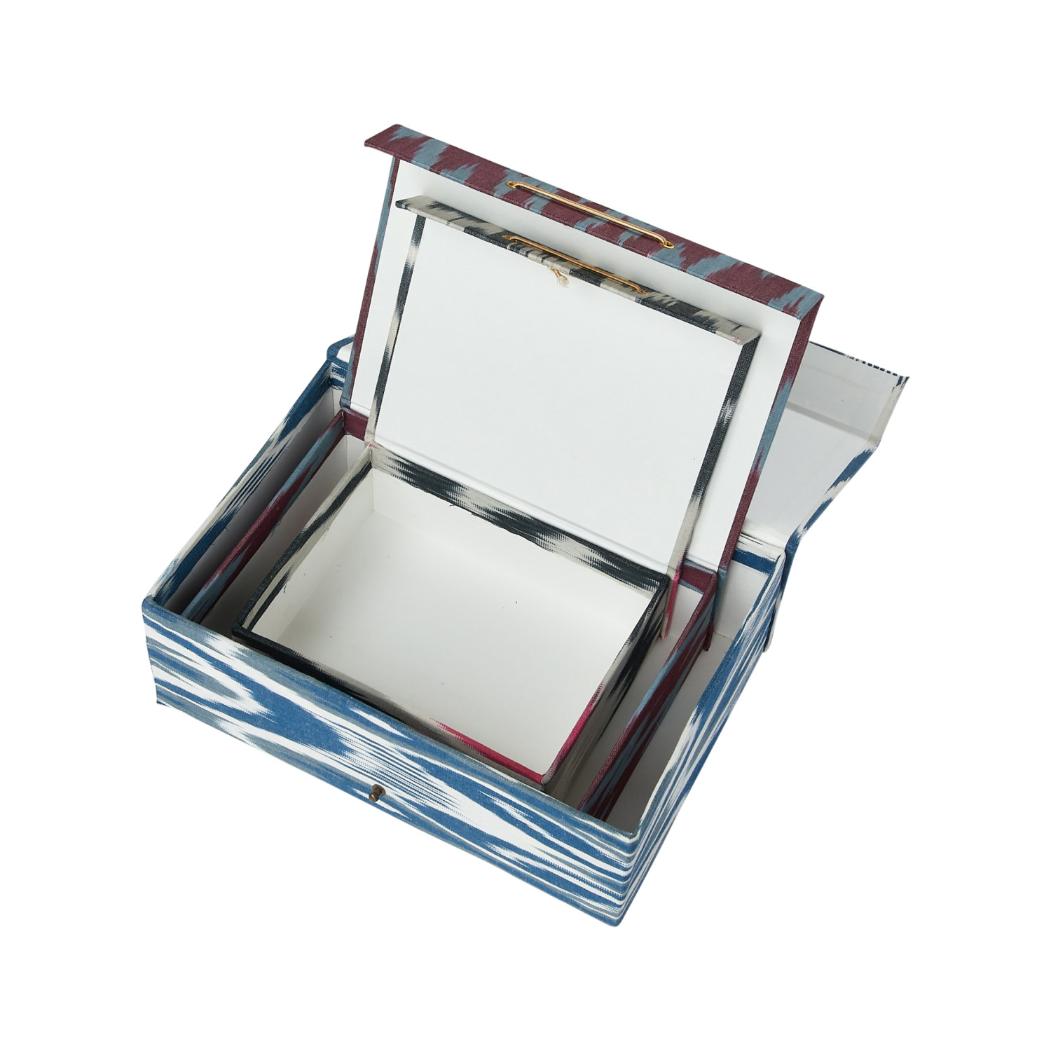 Catalog Name: 11-3/4"L x 8"W x 4"H, 10-1/4"L x 7-1/2"W x 3-1/4"H & 8-1/4"L x 6-1/4"W x 2-3/4"H Found Cotton Boxes w/ Lids, Ikat & Closures, Multi Color, Set of 3 (Each One Will Vary)