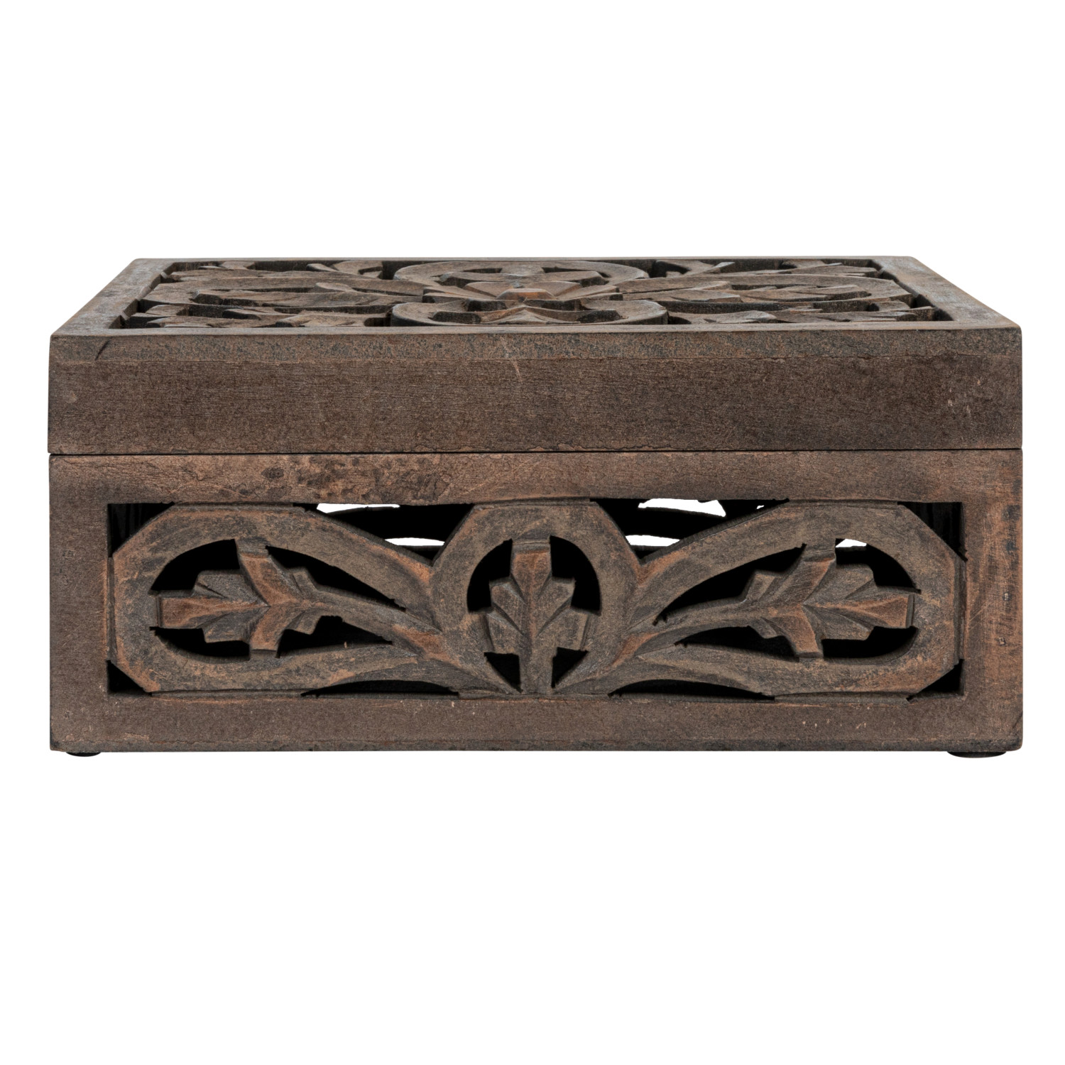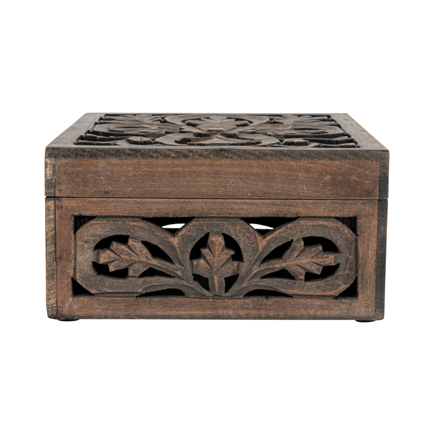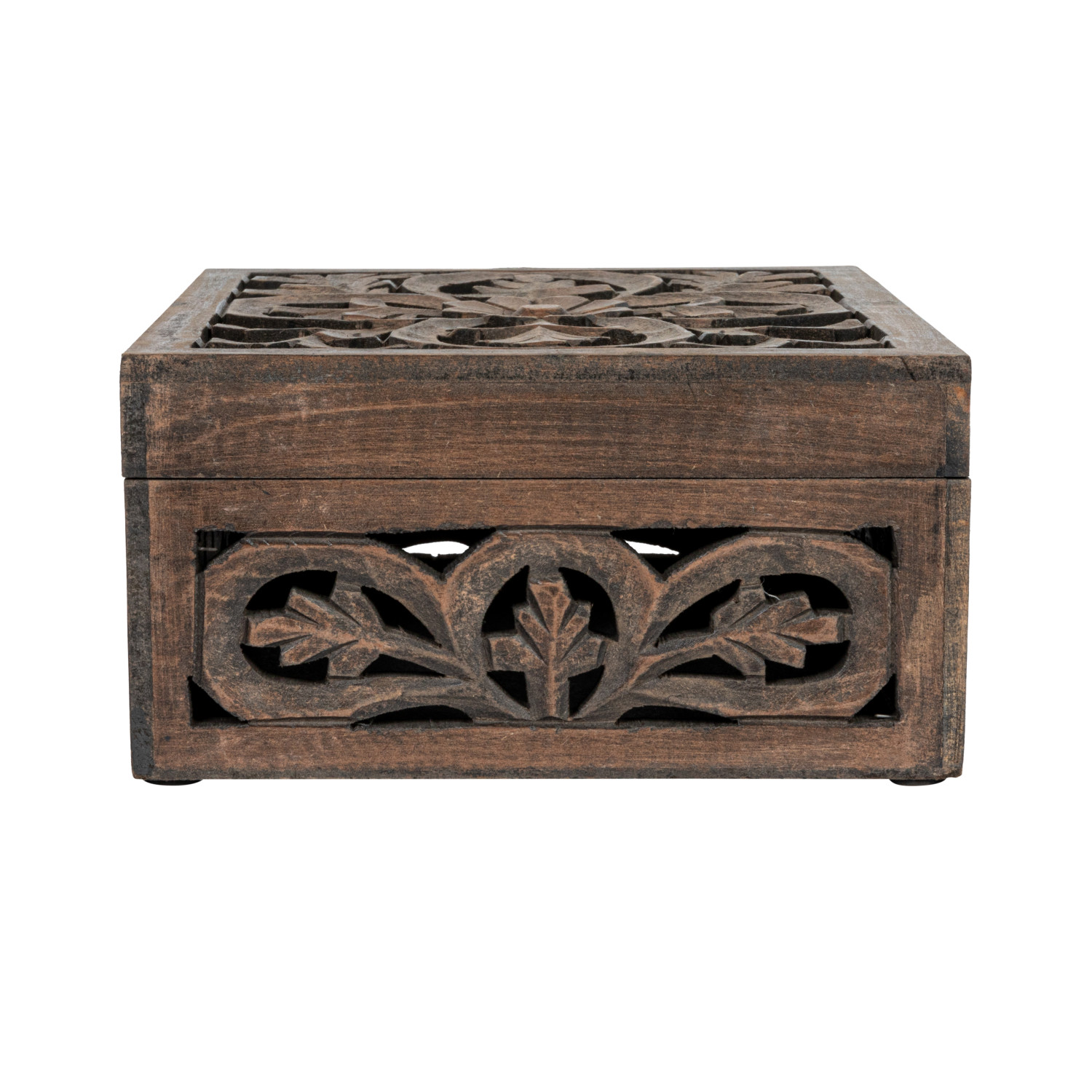 With a wide range of cabinets, canisters, and shelves, customers are provided with a diverse selection of materials and styles to cater to their individual tastes and decor preferences. Whether the need is to store belongings, showcase cherished items, or add a touch of personal flair, options abound, including combinations of wood and cane, iron, and glass, contemporary and vintage, farmhouse and boho. By perusing the assortment of display cabinets, dressers, and wall-mounted shelves, individuals can curate a visually captivating and customized interior that reflects their unique aesthetic and organizational needs. From bedrooms and living rooms to dining areas and office spaces, these cabinets, canisters, and shelves offer versatile solutions for any setting. . Organize any space with this set of three nesting boxes crafted from carved reclaimed wood and mango wood; each box features a unique design, intricately carved into the wood surface. Blend seamlessly with a variety of interior design styles, from traditional and rustic to eclectic and bohemian, the deep espresso finish adds warmth and richness to any room. These nesting trays feature unique carved designs on the reclaimed wood and mango wood surface, with an espresso finish that accentuates the wood's natural beauty and offers versatility in organizing different items. Made of various wood items with brass hinges.
