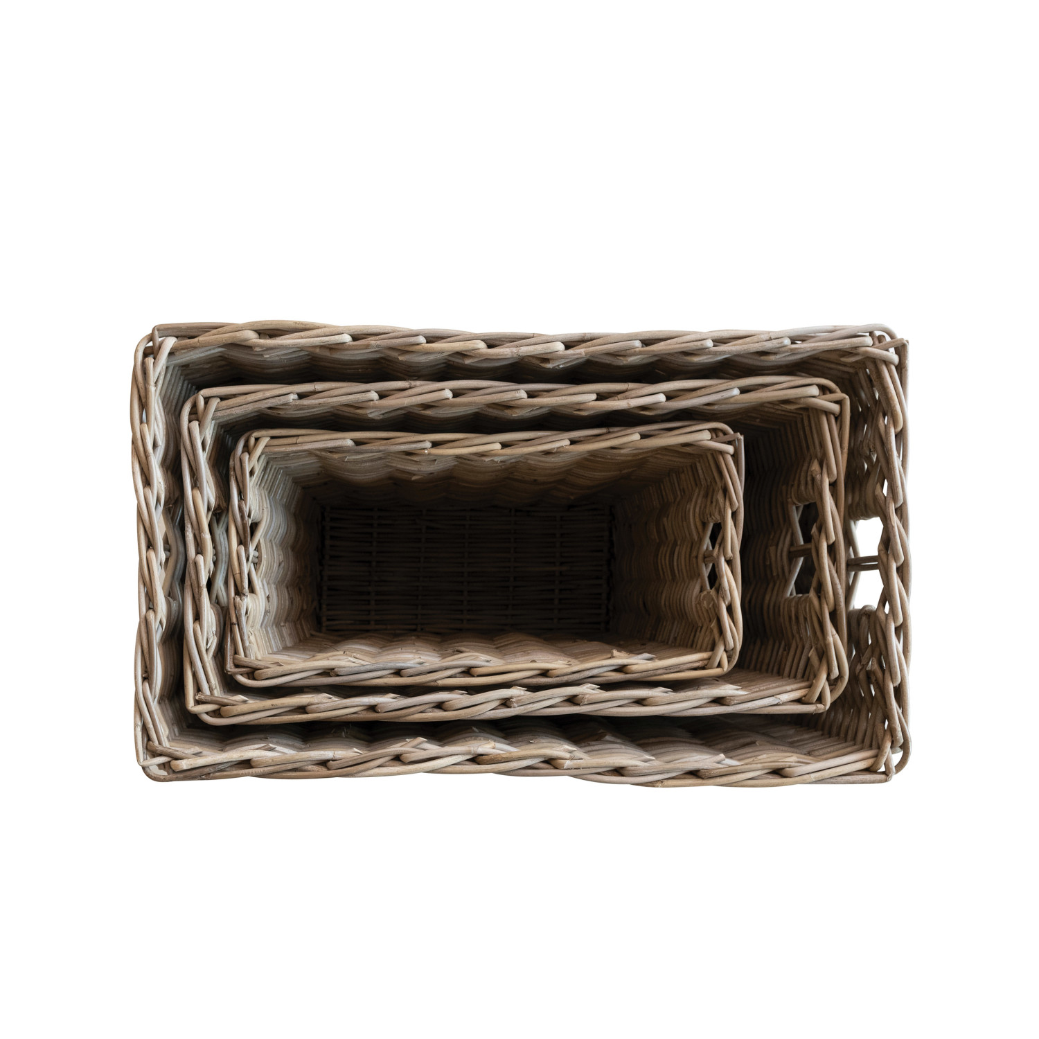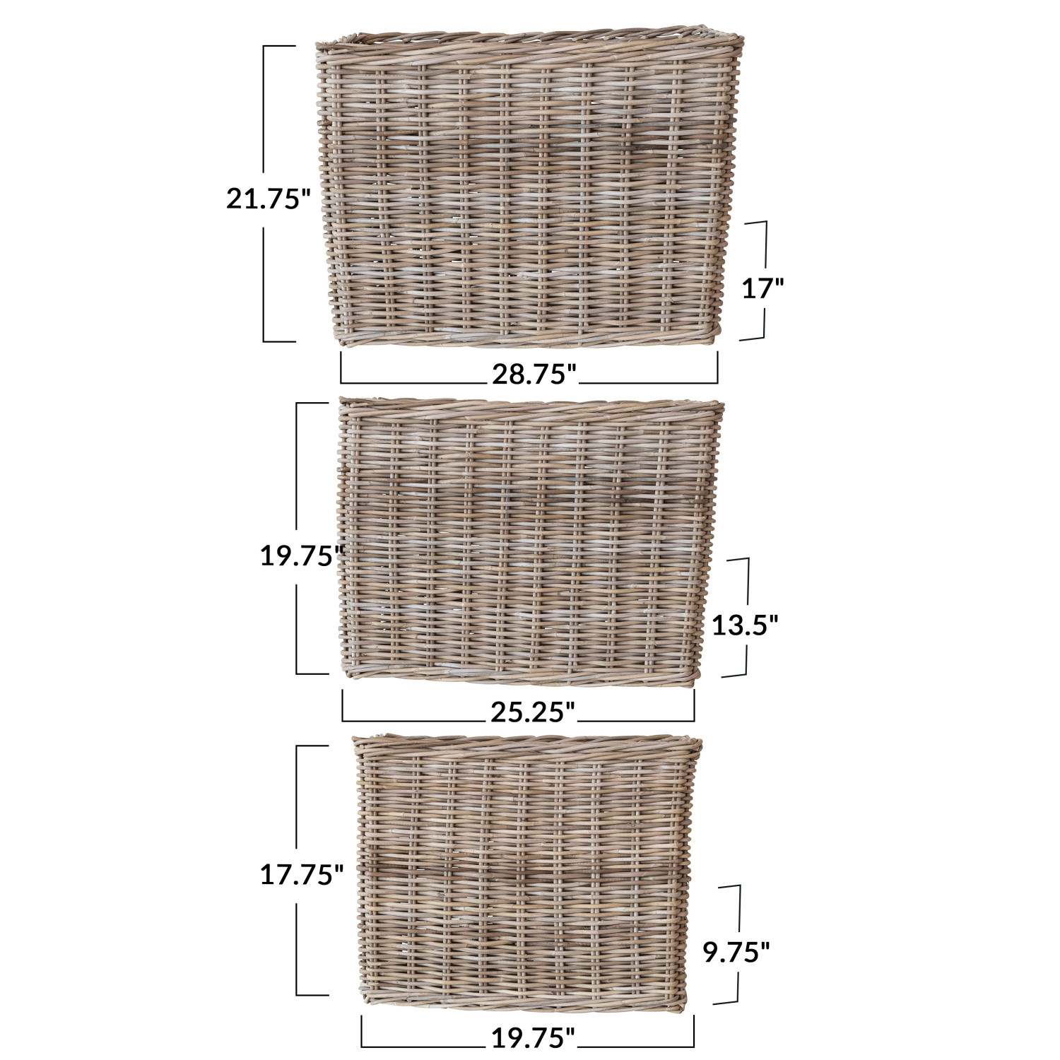 This set of three rectangular baskets is a beautiful and functional piece that will enhance the home's natural charm. The baskets are made of woven rattan, an eco-friendly and durable material handwoven by skilled artisans. The rattan has a natural color that adds warmth and harmony to any space. The baskets also have handles that make them easy to carry and move. Use them to store or display items on any surface or setting, where they will create a cozy and organized ambiance with their versatile and spacious design. Whether used for decoration or storage, this set of three rectangular baskets will add a touch of texture and rusticity to any space. The largest size measures 28.75 inches in length, 17 inches in width, and 21.75 inches in height. Keep any items organized and stylish with these versatile and spacious baskets.