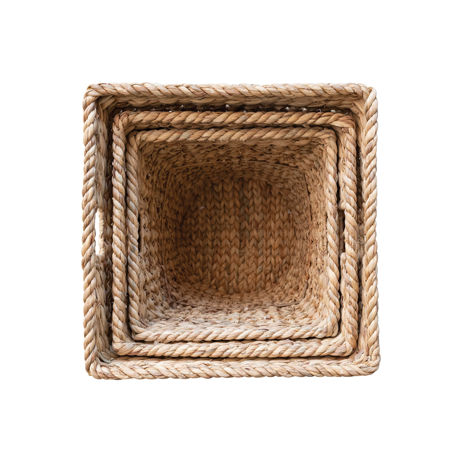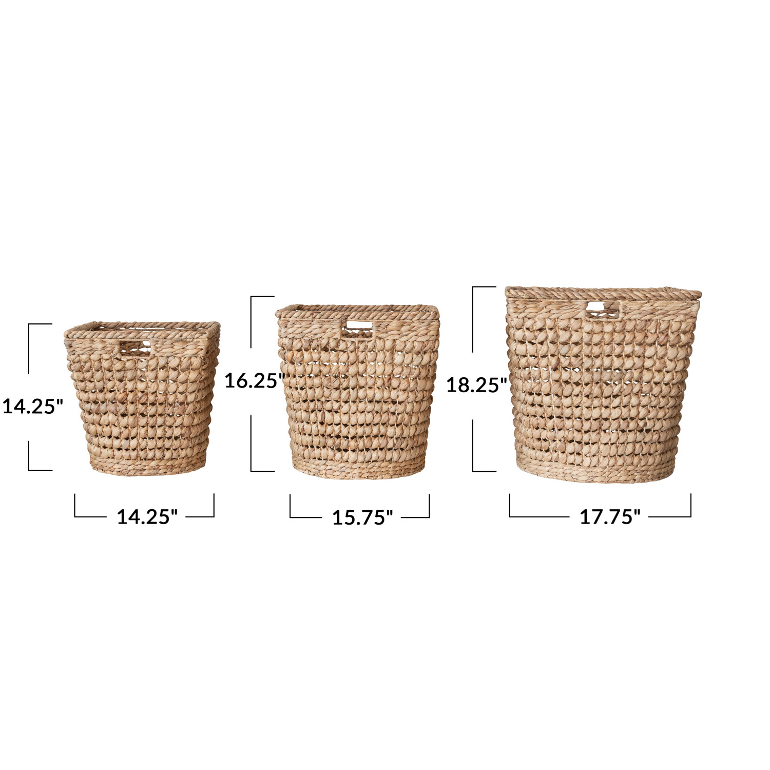 Catalog Name: 17-3/4" Square x 18-1/4"H, 15-3/4" Square x 16-1/4"H & 14-1/4" Square x 14-1/4"H Hand-Woven Water Hyacinth & Metal Baskets w/ Handles, Natural, Set of 3