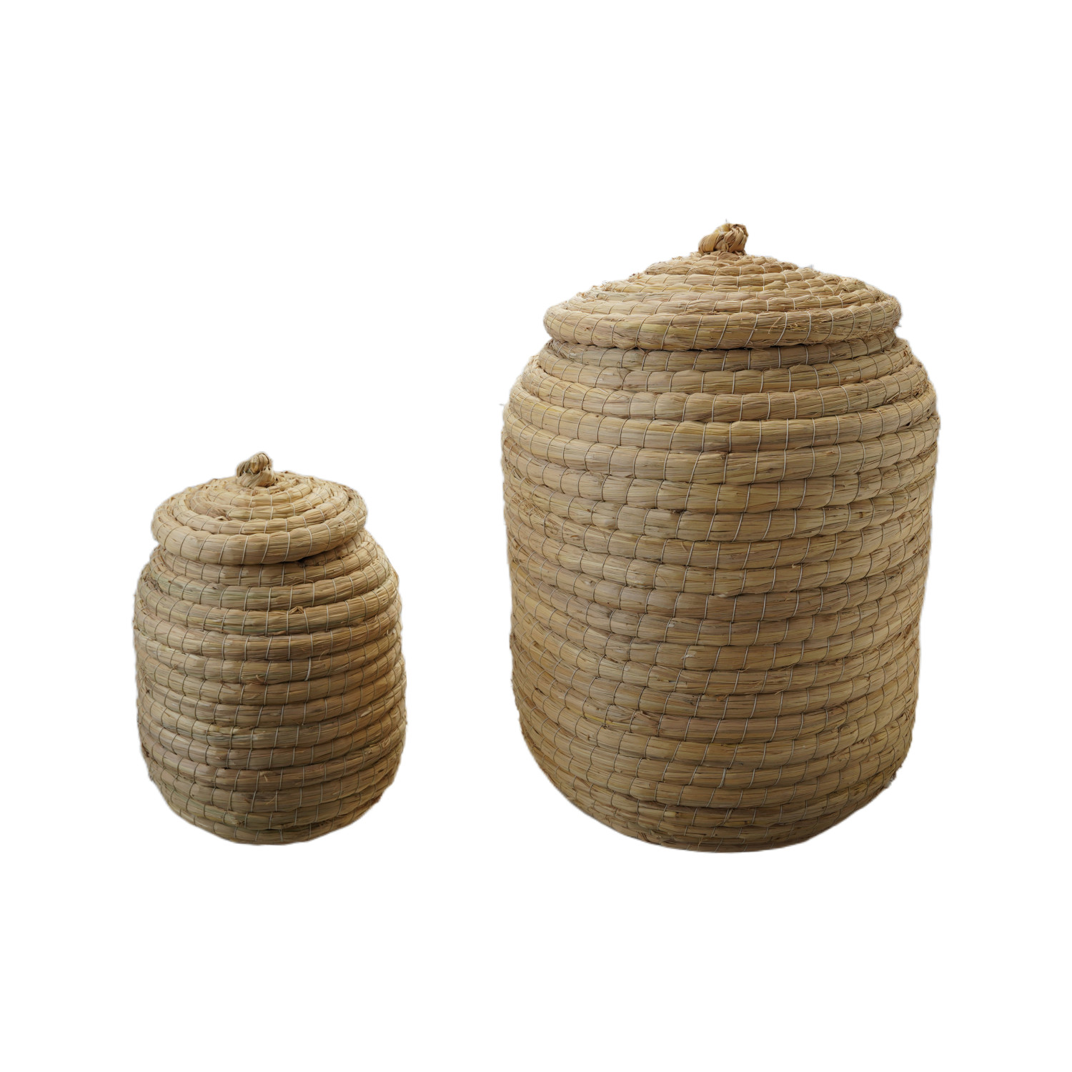 Catalog Name: 14-1/2" Round x 19"H & 9-1/4" Round x 13"H Hand-Woven Straw Baskets w/ Lids, Natural, Set of 2