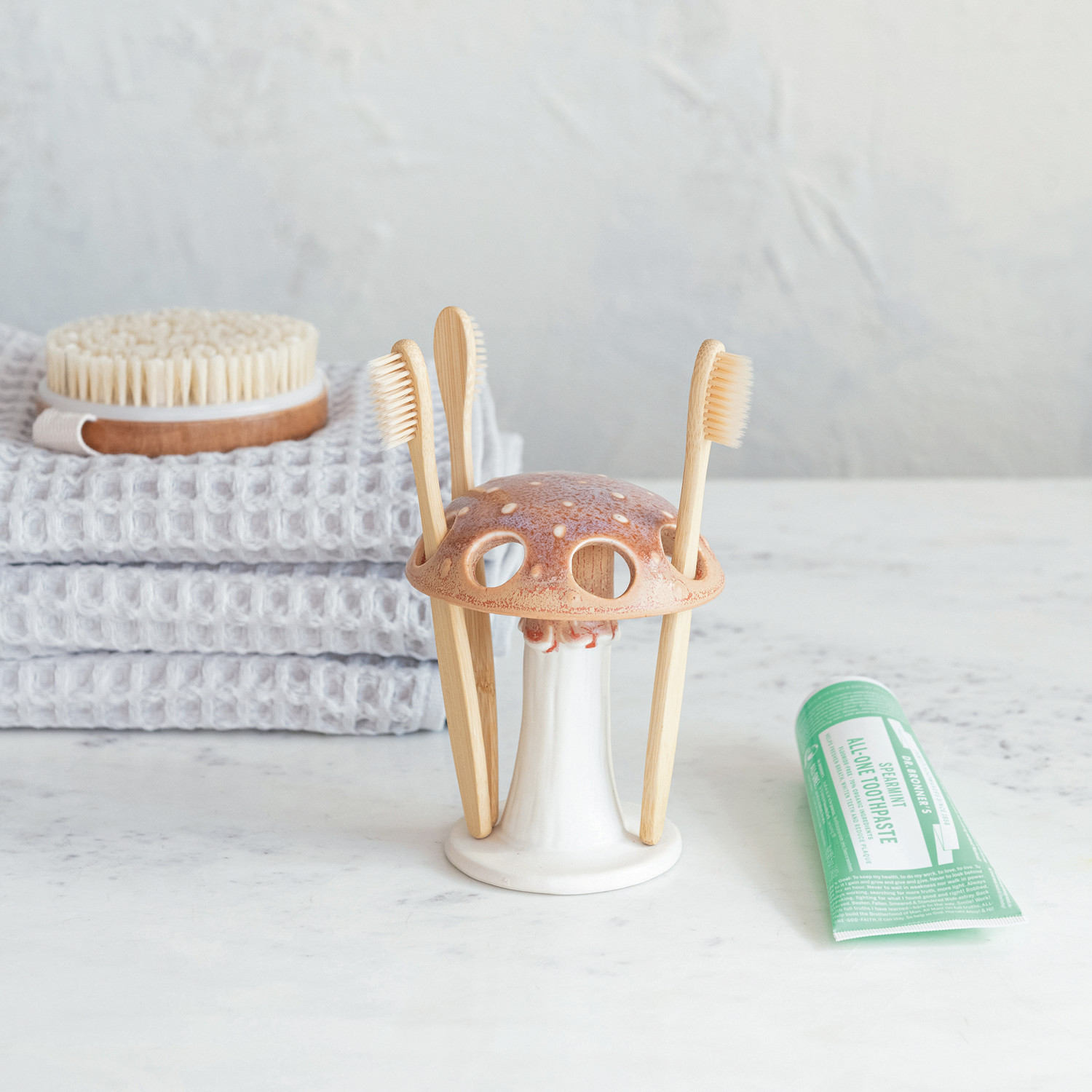 This Stoneware Toothbrush Holder, shaped like a quaint mushroom and finished with a reactive glaze, adds a playful yet rustic charm to the bathroom decor. Each holder varies slightly, giving a one-of-a-kind piece that's as functional as it is decorative. The round base and ample height accommodate multiple toothbrushes, while the earthy white and brown palette complements an array of color schemes. Whether style is eclectic, inspired by a garden, or leans towards the rustic, this toothbrush holder brings a touch of whimsy to a daily routine.