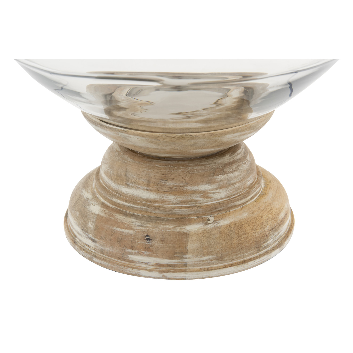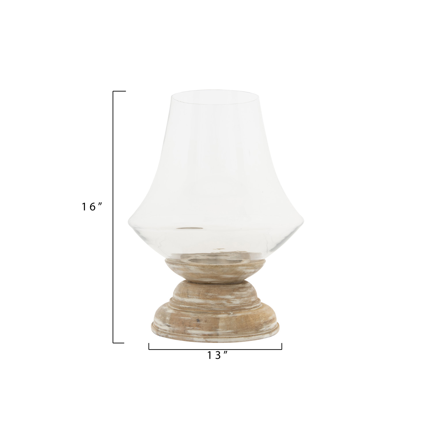 Catalog Name: 13" Round x 16"H Hand-Blown Glass Hurricane w/ Mango Wood Pedestal, Whitewashed, Set of 2, Truck Ship (Holds 4" Pillar)