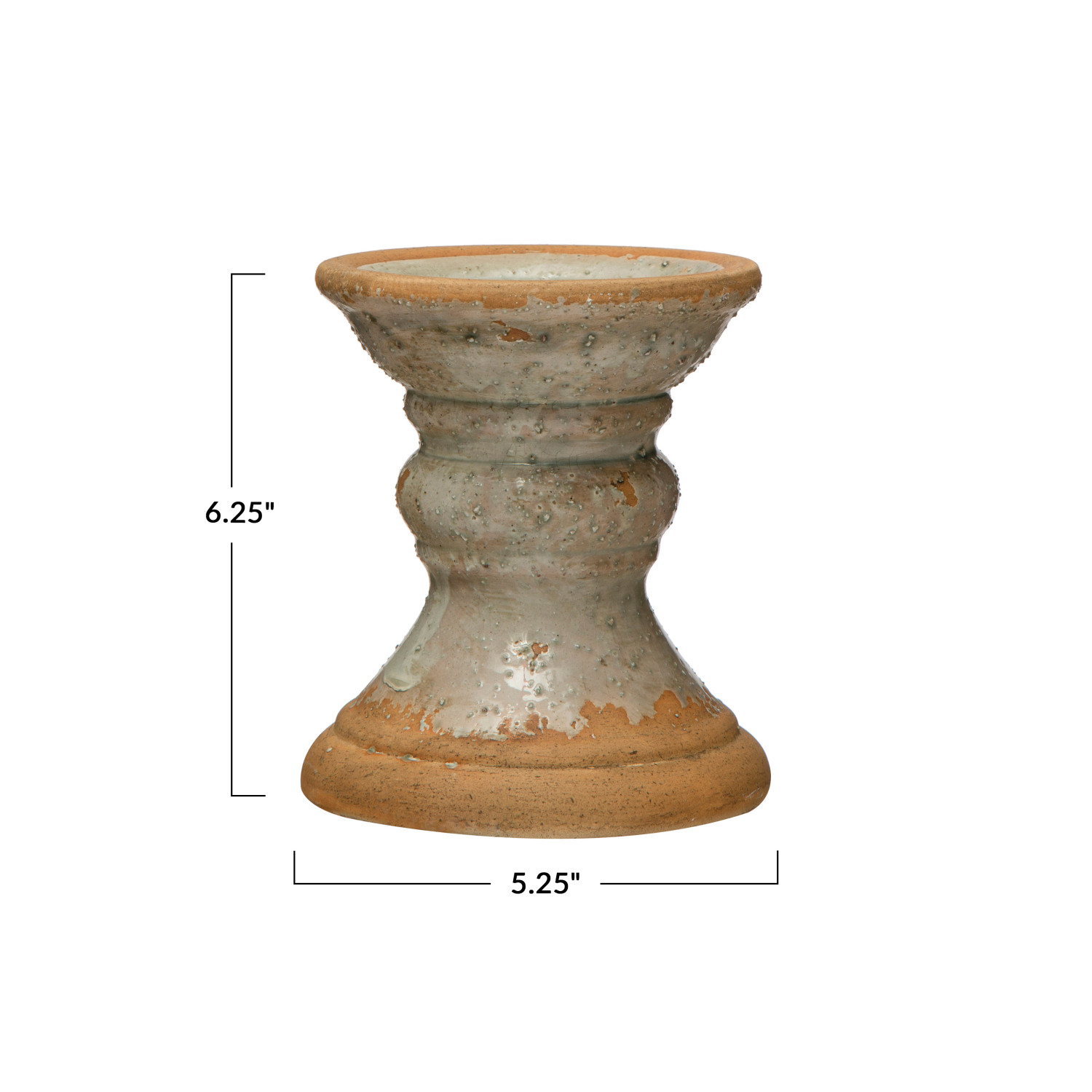 Catalog Name: 5-1/4" Round x 6-1/4"H Terra-cotta Pillar Holder, Heavily Distressed Finish, Mint Color (Holds 4" Pillar)