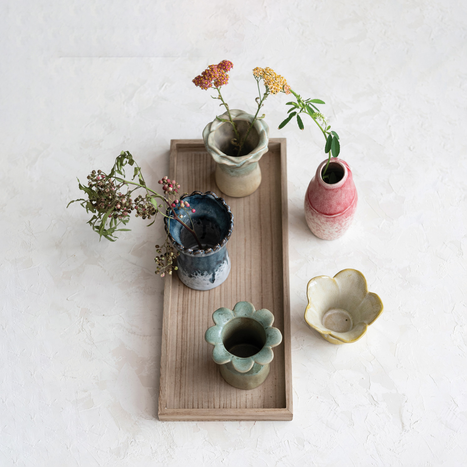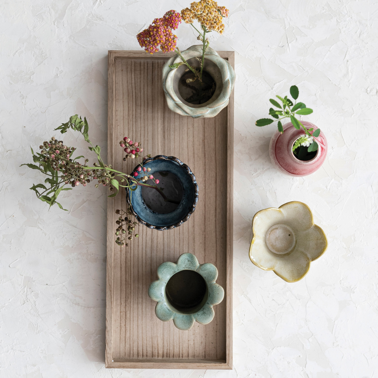 Catalog Name: 16-3/4"L x 6-3/4"W x 5-3/4"H Wood Tray w/ Stoneware Vases/Votive Holders, Reactive Glaze, Multi Color, Set of 6 (Each One Will Vary)