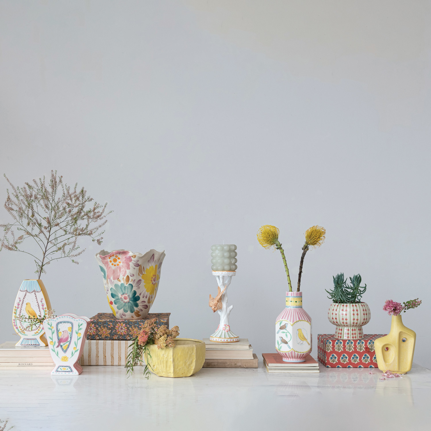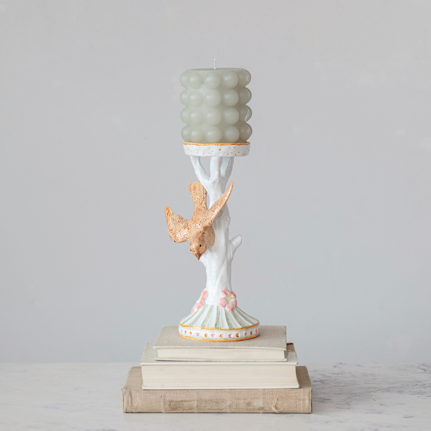 Mix and match the sculptural silhouettes, stylish hues, and unique finishes of our candle and incense holder collection to create the ultimate tablescape. Instantly transform a dining table, dresser, or mantelpiece into a stunning display of ambiance and warmth with carefully chosen bases for a refined candlelight arrangement. Choose from a wide array of materials from iron and marble to wood and stone, and styles from mid-century modern and glam to farmhouse and vintage. From classic taper holders to global-inspired pillar holders and contemporary incense burners and shimmering votives, this collection will create a welcoming atmosphere that is guaranteed to impress. This French country-inspired candle holder features a multicolor silhouette of a bird flying near a tree. Display in a living space of any style from cottage to French country. Wipe clean with dry cloth. Made from resin and stone powder.