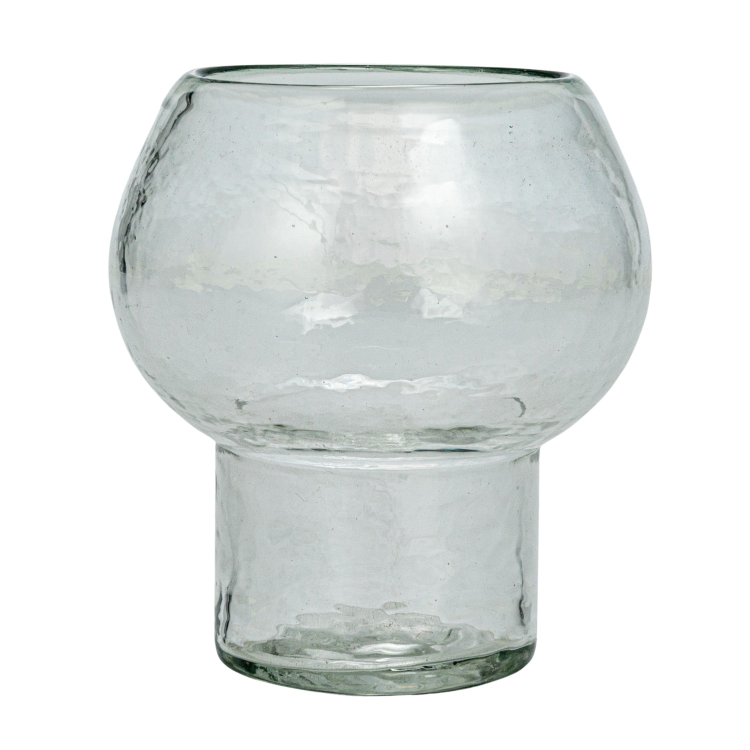 The Reclaimed Glass Footed Votive Holder in Clear is a charming and eco-friendly addition to any home decor. Handcrafted from recycled glass, this votive holder showcases both its commitment to sustainability and its stunning design. With a diameter of 3.5 inches and a height of 4 inches, it is the perfect size to hold a single votive candle, creating a warm and inviting ambiance. The clear glass allows the flickering light to dance beautifully, casting enchanting shadows and creating an atmosphere of relaxation. The footed base adds an elegant touch to the overall aesthetic, elevating this votive holder above ordinary ones. Whether used as a centerpiece or placed in different corners of the living space, this piece is versatile enough for any occasion or room. Create a cozy atmosphere while making a positive impact on the environment.