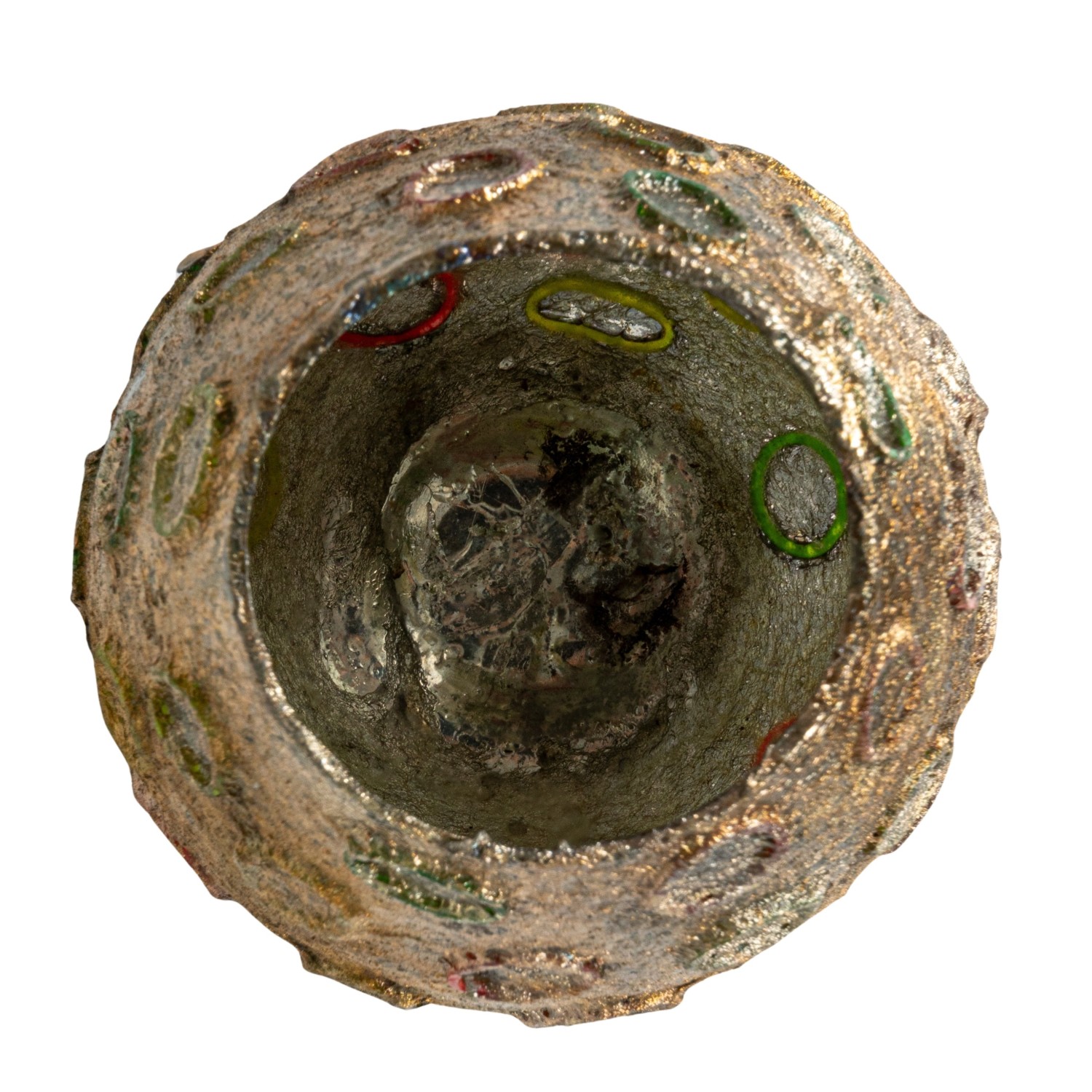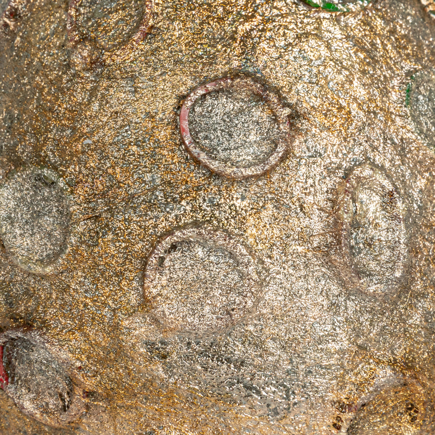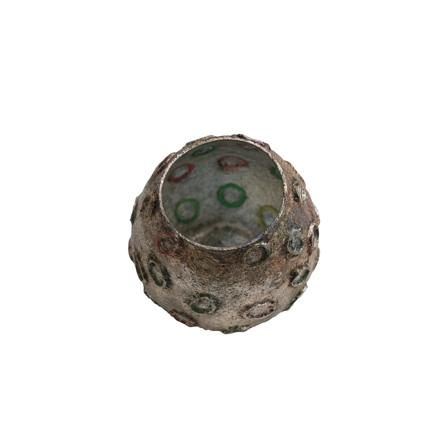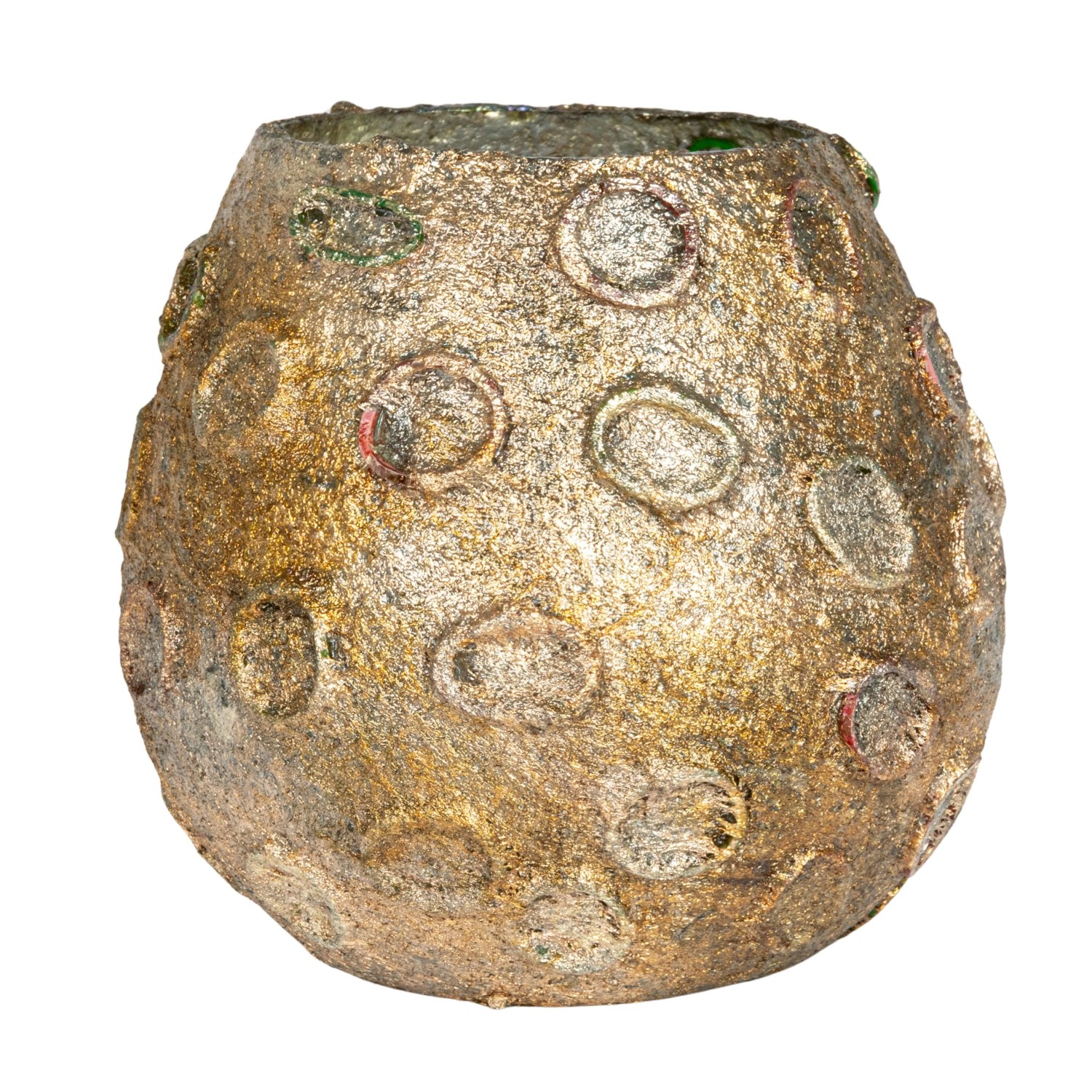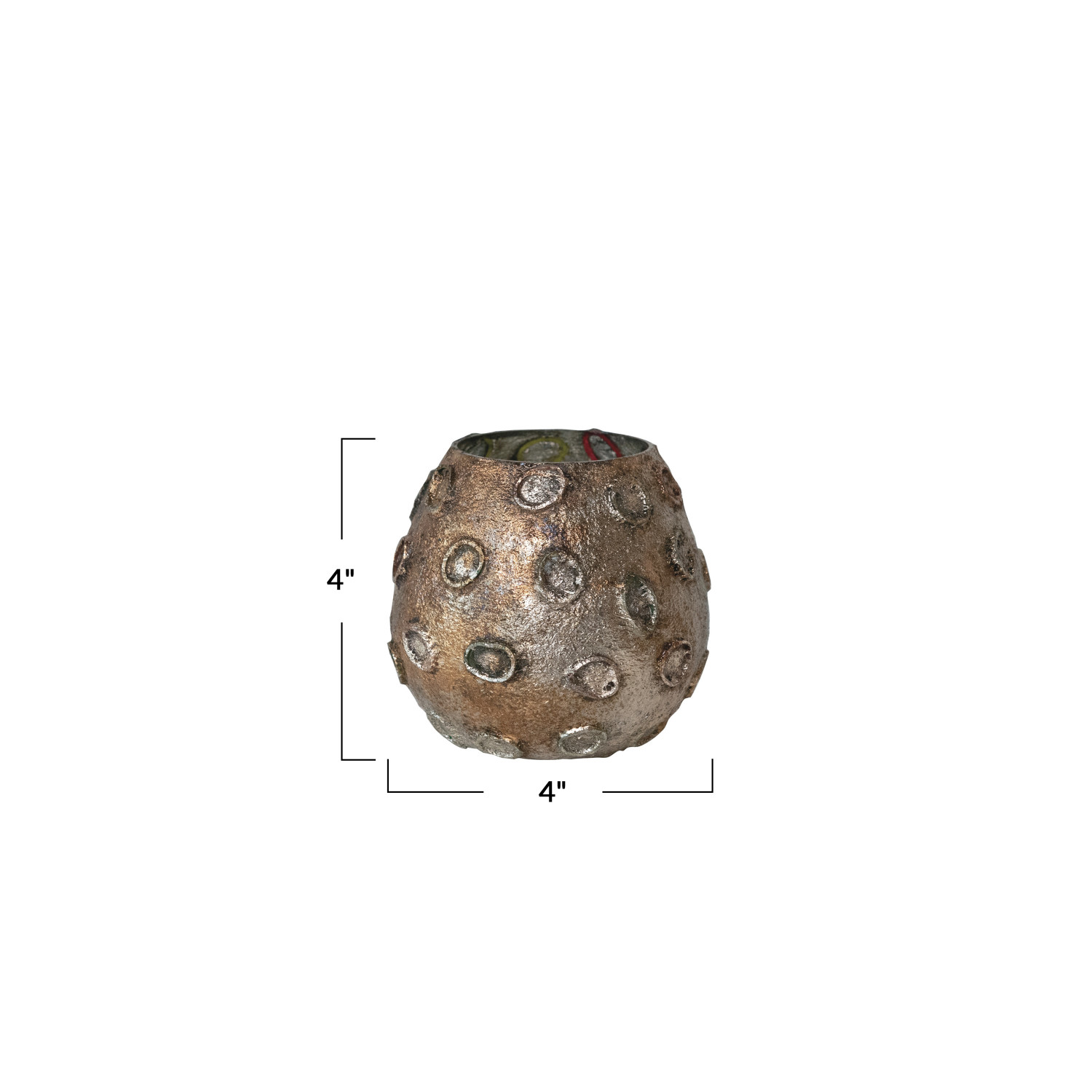 Catalog Name: 4" Round x 4"H Glass Tealight Votive Holder w/ Embossed Rubber Band Circles, Metallic Finish