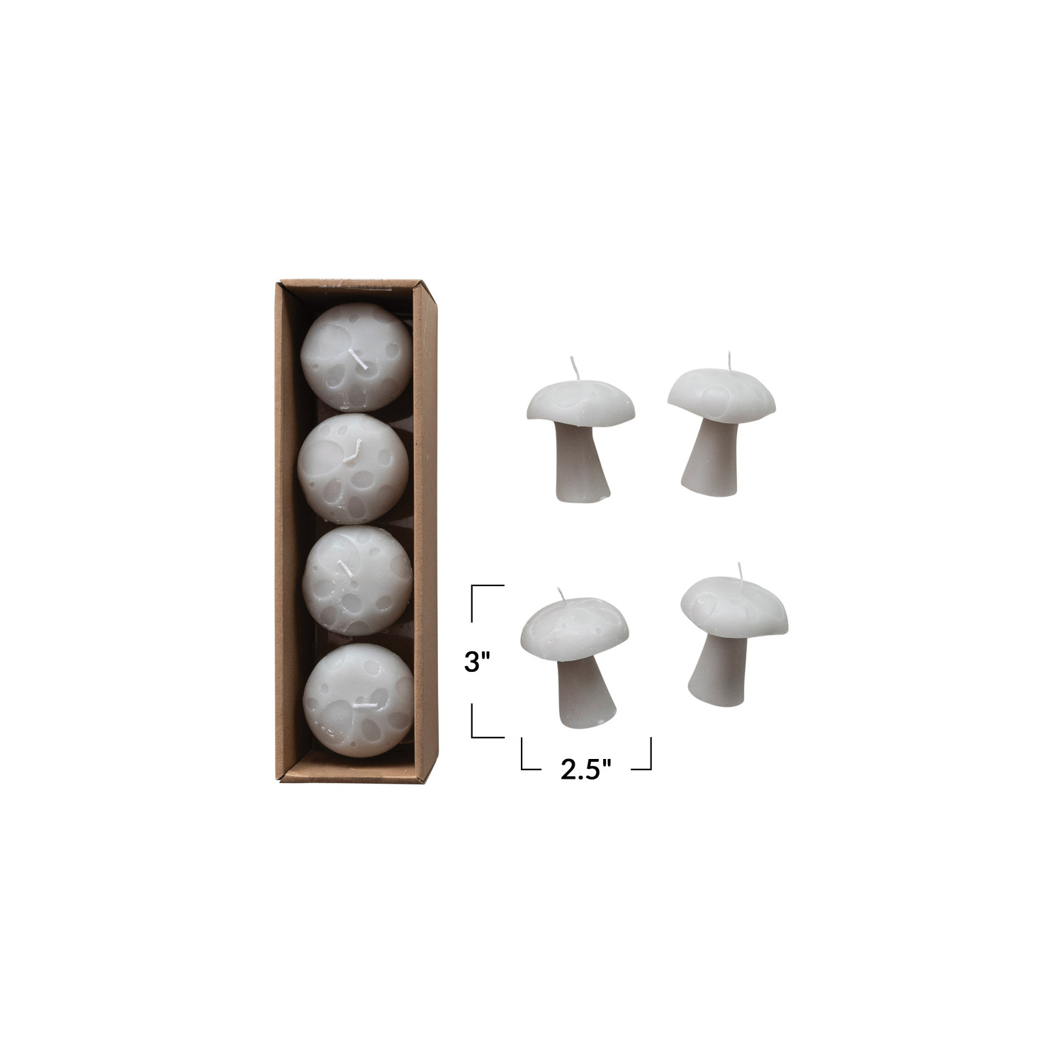 Catalog Name: 2-1/2" Round x 3"H Unscented Mushroom Shaped Candles in Box, Grey, Set of 4 (Approximate Burn Time 2 Hours)