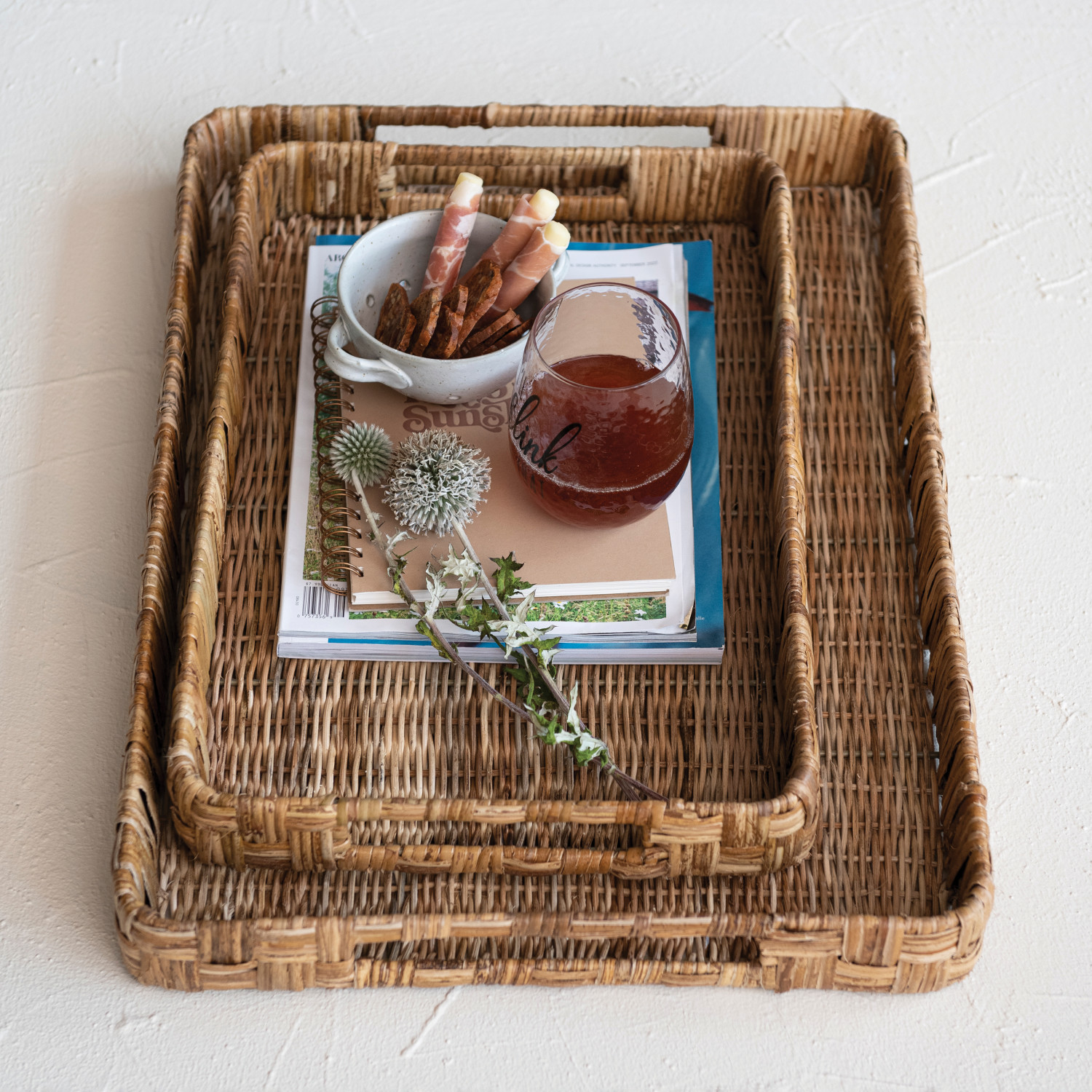 Decorative Hand-Woven Rattan Trays w/ Handles, Natural, Set of 2