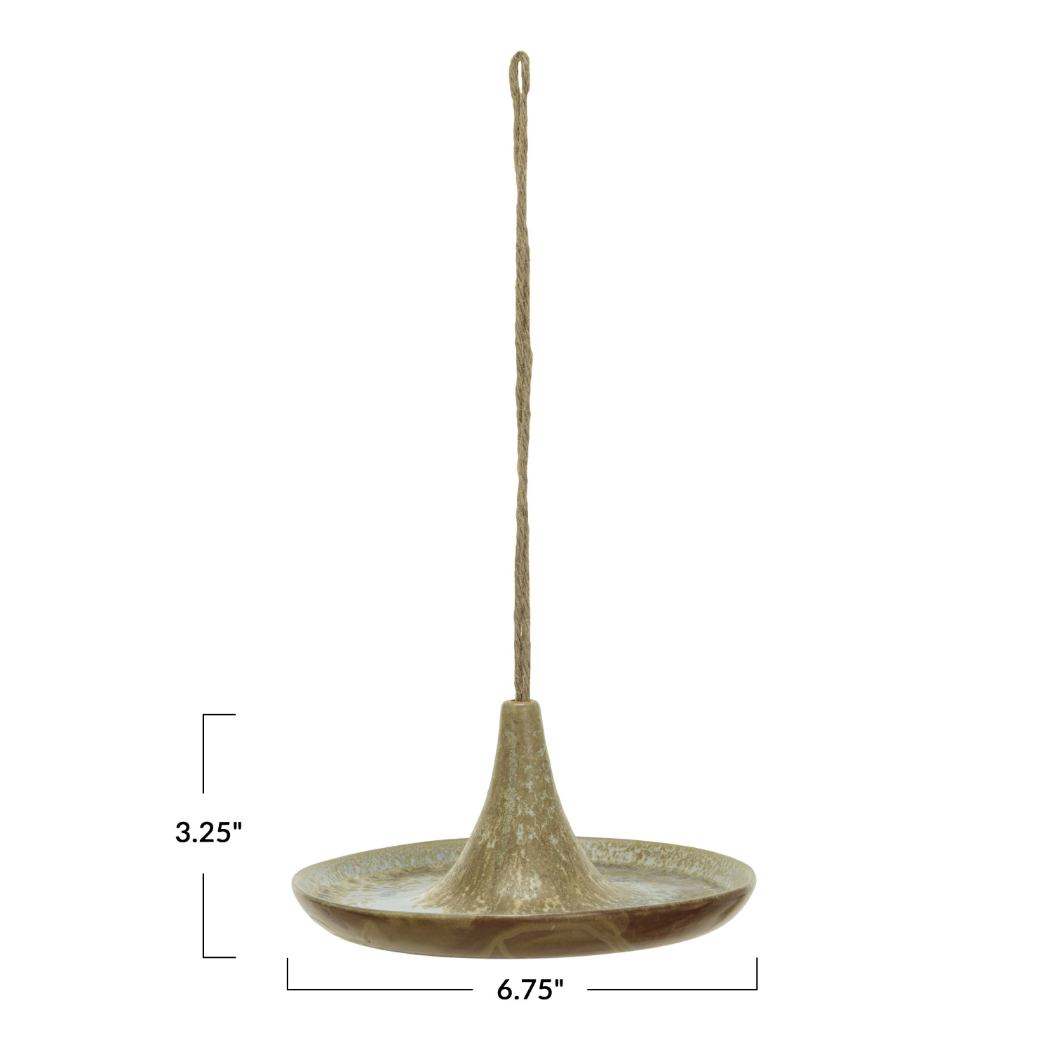 Attract feathered friends to the outdoor space with this Stoneware Bird Feeder with Jute Hanger. This lovely bird feeder has a tan reactive glaze that gives it a unique and rustic look. The round shape and the large opening make it easy for birds to access the seeds inside. The jute hanger hangs it from a tree branch, a hook, or a fence. Create a farmhouse, coastal, modern, or boho vibe in the garden or patio, this bird feeder will fit right in. It is made of durable stoneware that can resist weather and wear. It measures 6.75 inches in diameter and 3.25 inches in height, making it suitable for small to medium-sized birds. Give the backyard a cozy and inviting feel with this Stoneware Bird Feeder with Jute Hanger.