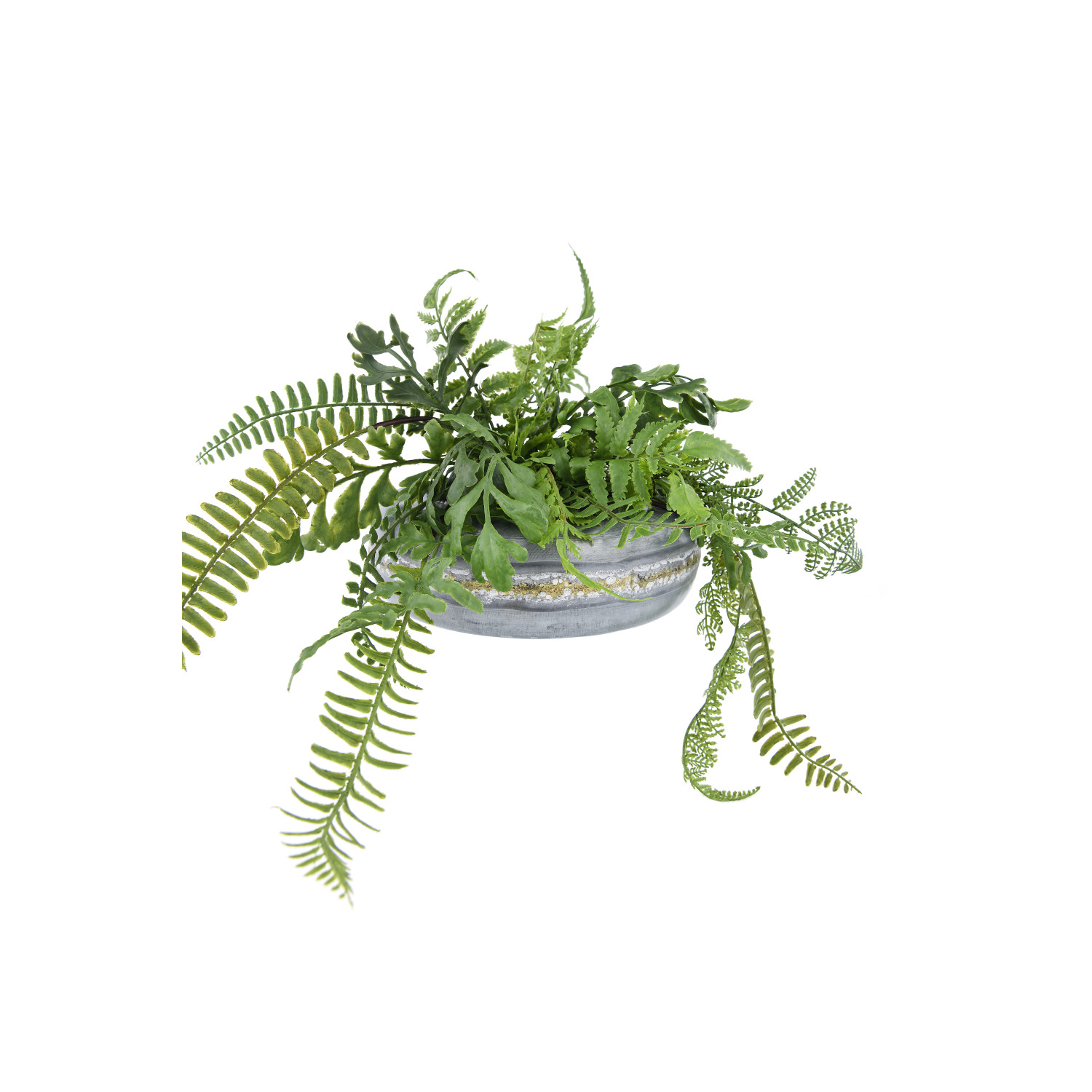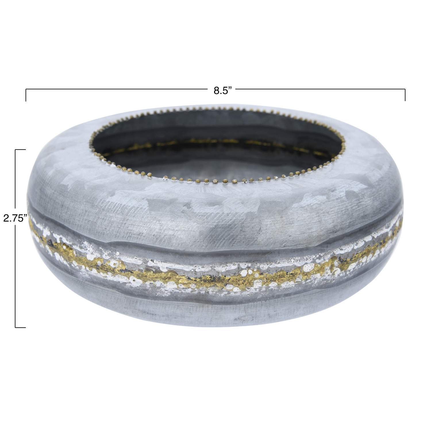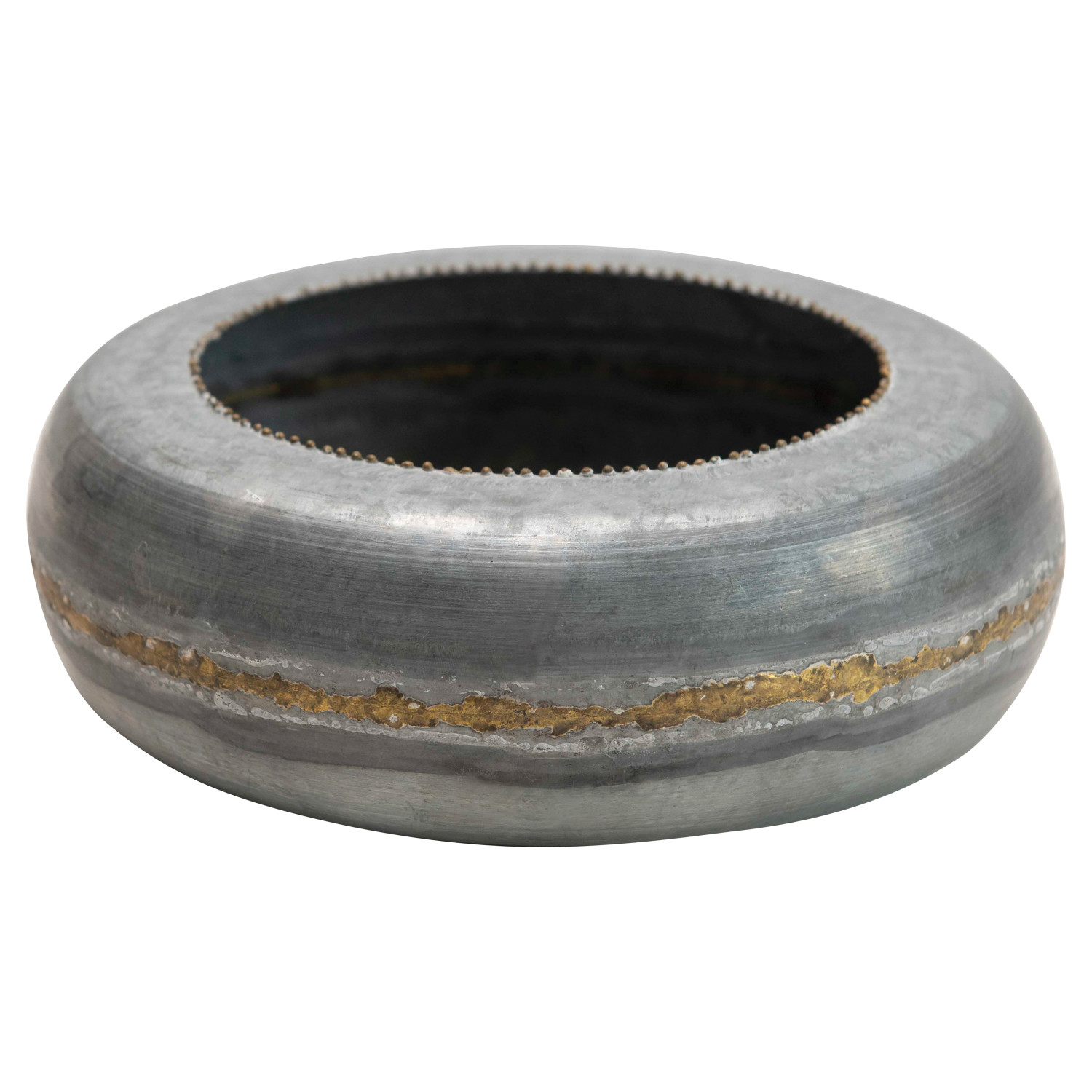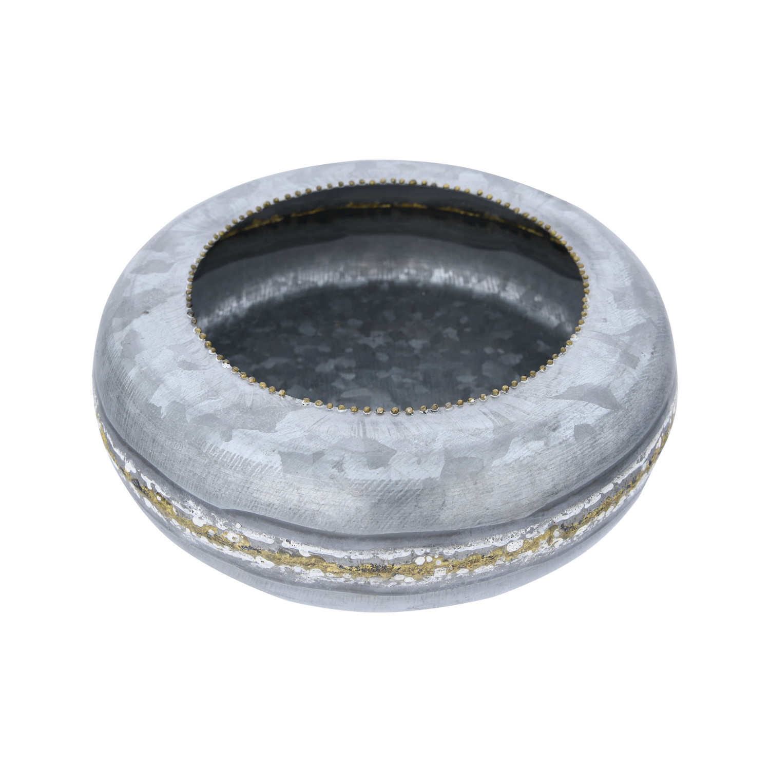 A gold band runs through the center of this round galvanized planter. The unique flat design makes it ideal for holding shorter plants and displaying in between shelves. For a drooping plant, place the planter on a pedestal and allow the leaves to cascade over the sides.