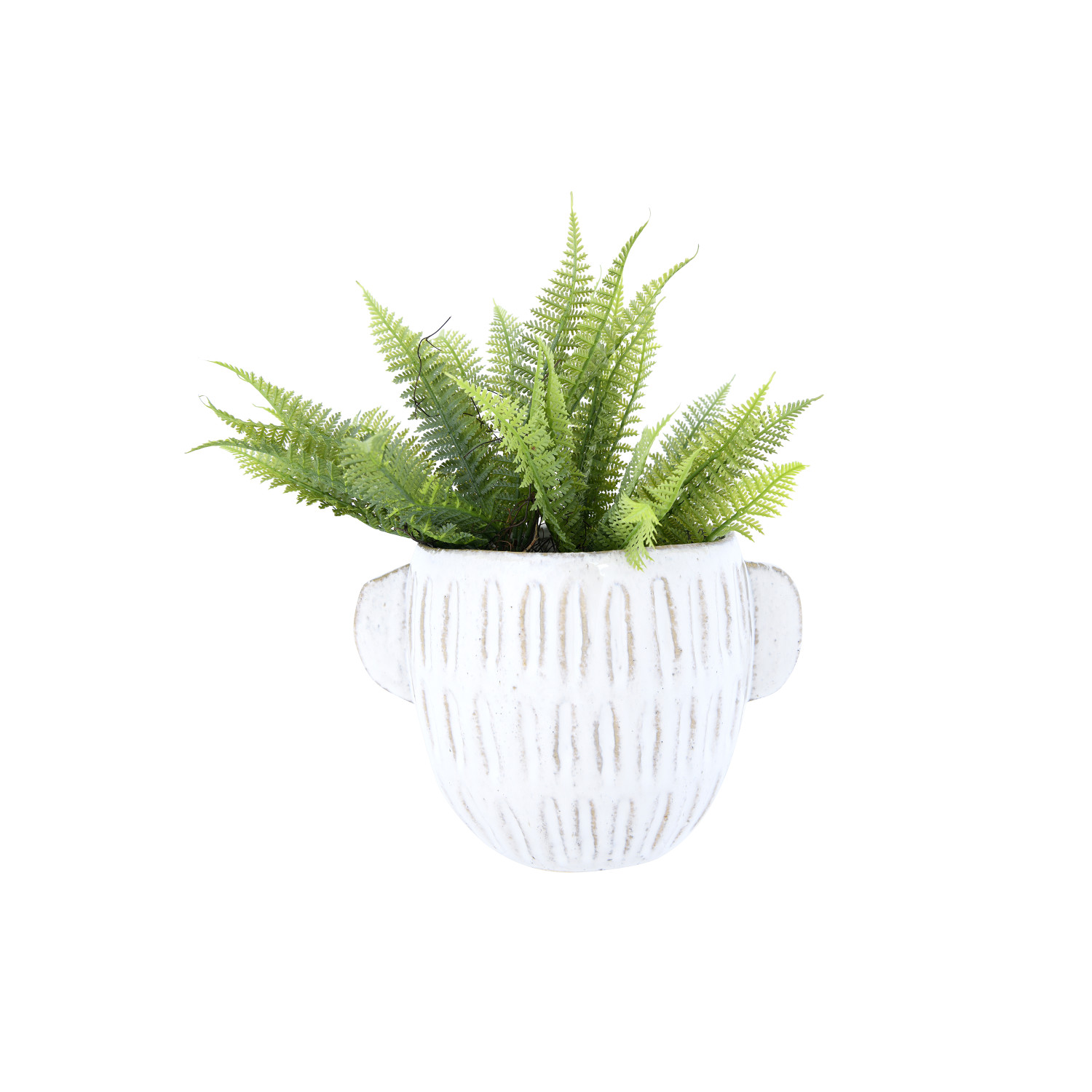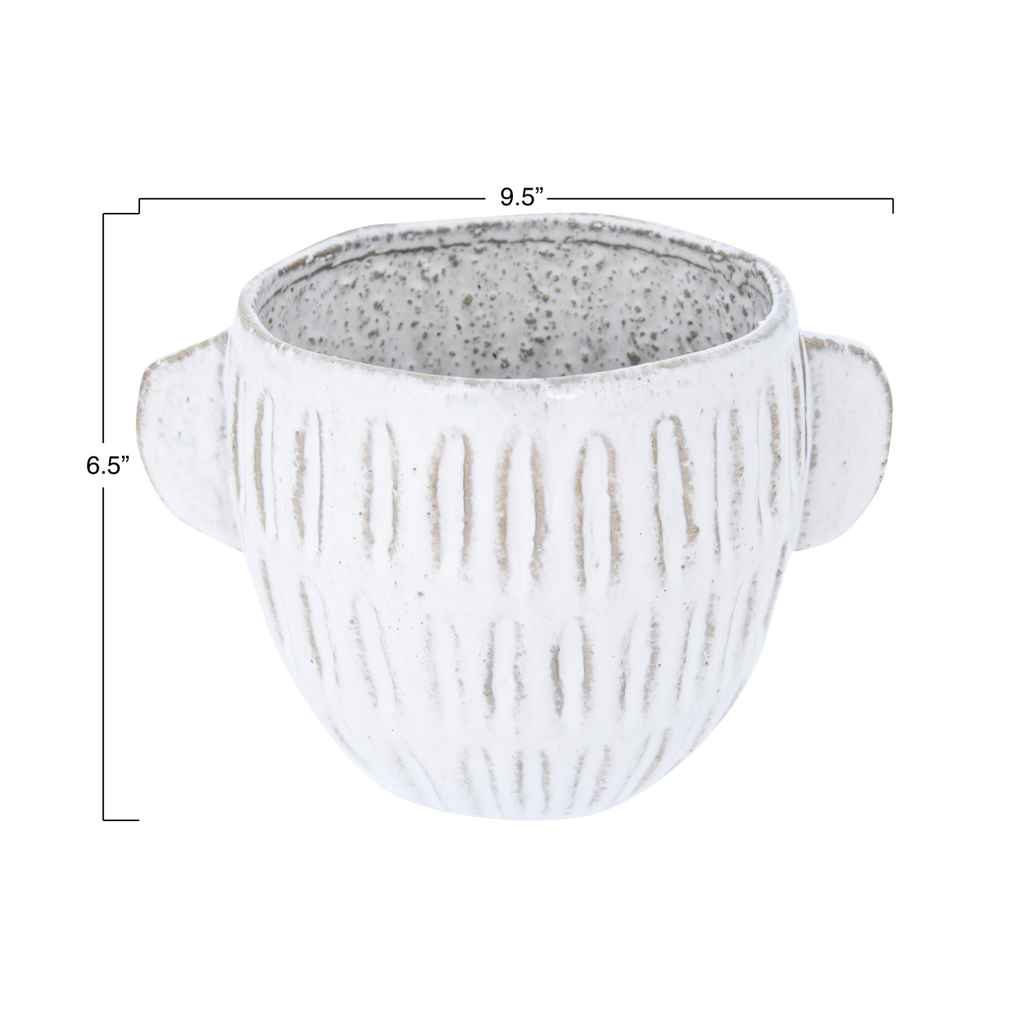 With ear-style handles, this off-white stoneware planter features a remarkable reactive glaze finish. The glazing process creates individual works of art on each distinctive piece. Fill it with a potted plant and display on a tabletop or mantel for an amazing accent to the room decor.