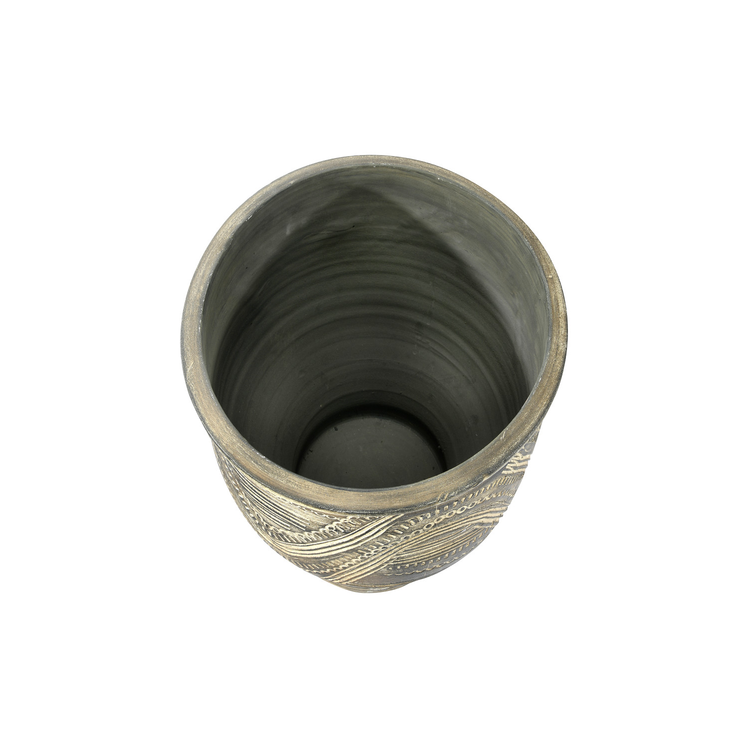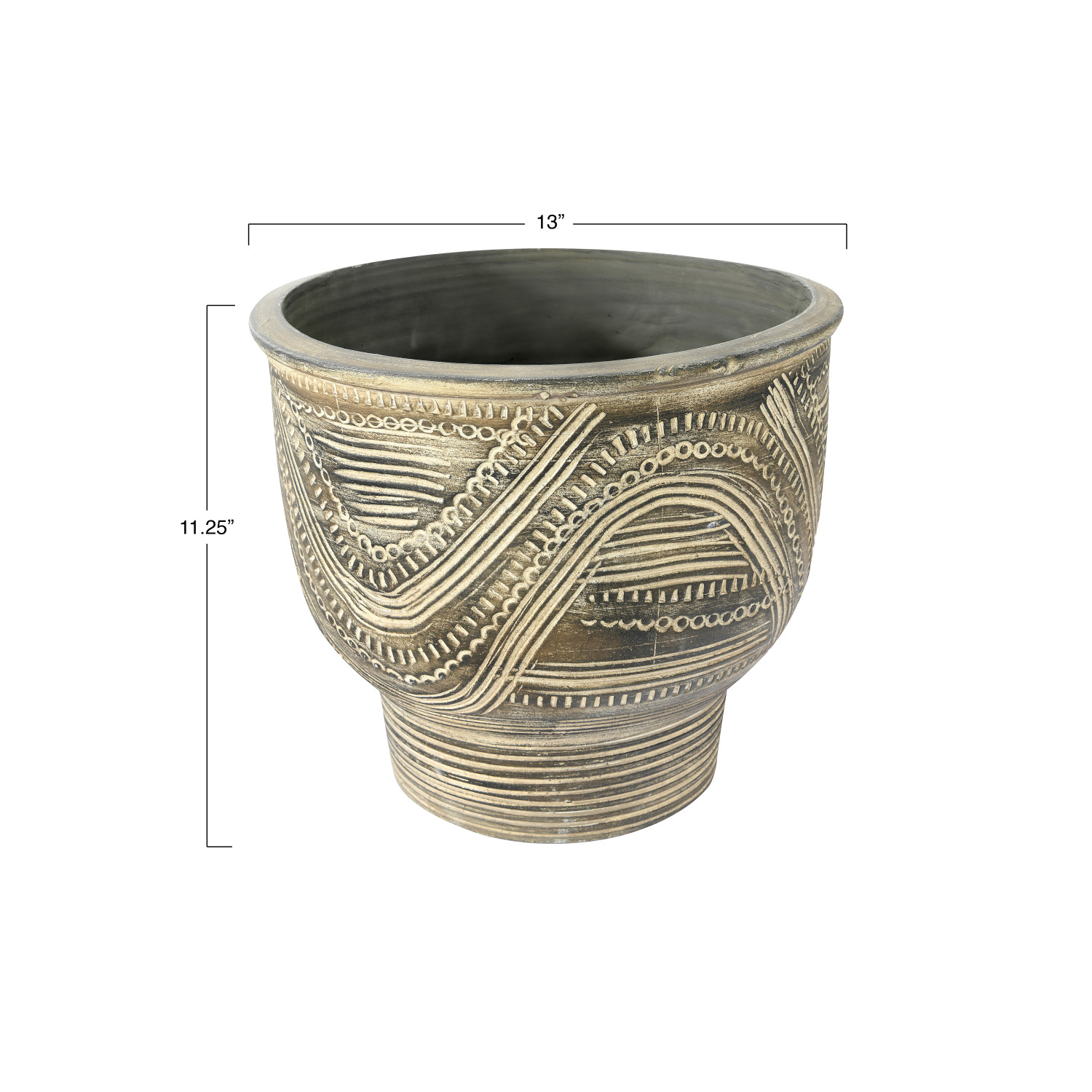 Catalog Name: 12-1/2" Round x 11-1/2"H Debossed Terra-cotta Planter, Distressed Black (Holds 9" Pot)