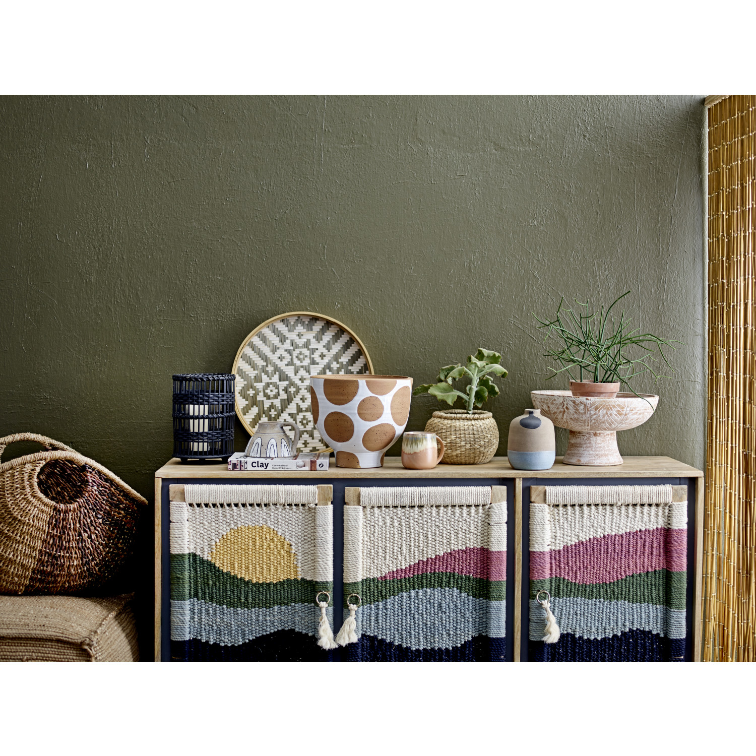 This terra-cotta pot has a white glaze with large and small natural terra-cotta dots carved into the clay. The planter has a circular base that extends up to hold the larger bowl shape. Place the pot indoors or outdoors. Add color with flowers and plants to really make this piece pop.