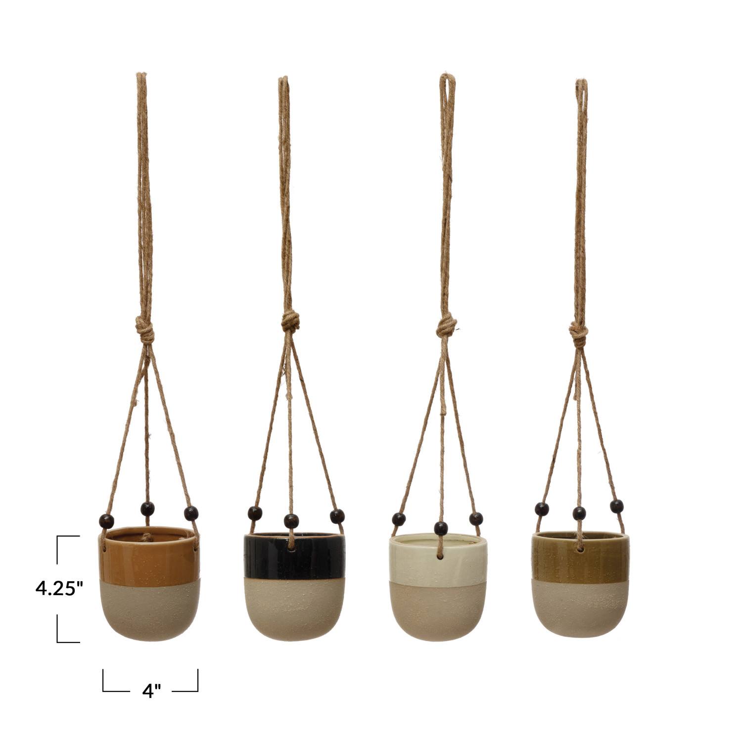 Catalog Name: 4" Round x 4-1/4"H Hanging Stoneware Planter w/ Black Wood Beads & Jute Rope Hanger, 4 Glazed/Unglazed Colors (Holds 4" Pot)