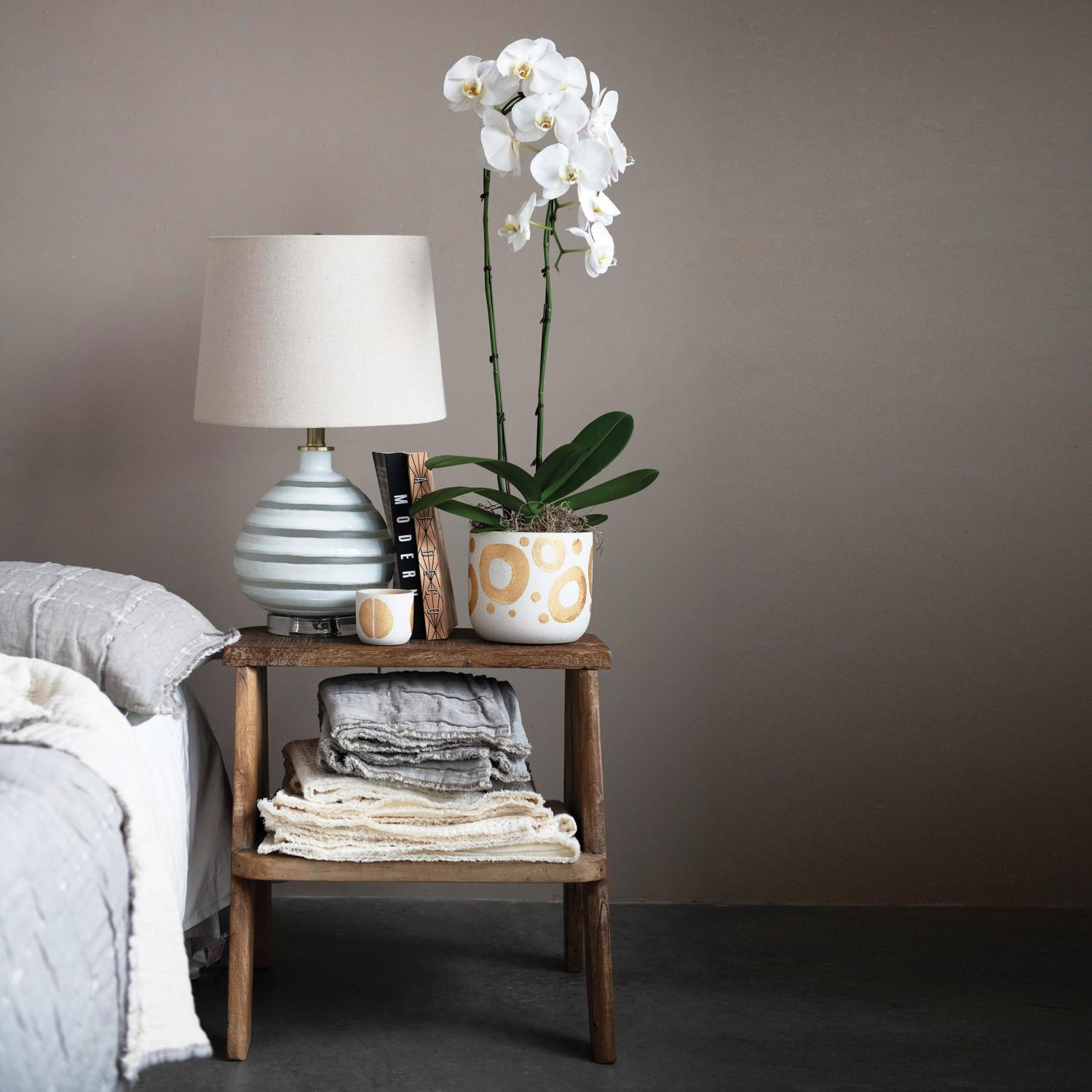 Elevate the home decor with this white stoneware planter with gold circles design, hand-painted by skilled artisans. This planter features a simple yet elegant design, with a white background and a gold circles pattern that adds a touch of sparkle and sophistication. The stoneware material is durable and sturdy, and the smooth and glossy finish enhances the beauty of the planter. The planter does not have a bottom hole, so place it on any surface without worrying about water damage. The planter measures 6.5 inches in diameter and 6 inches in height, and it can hold a 5-inch pot. It is perfect for displaying beautiful plants, flowers, or herbs, indoors or outdoors. This planter is a great way to add some minimalist, modern, or glam style to any home.