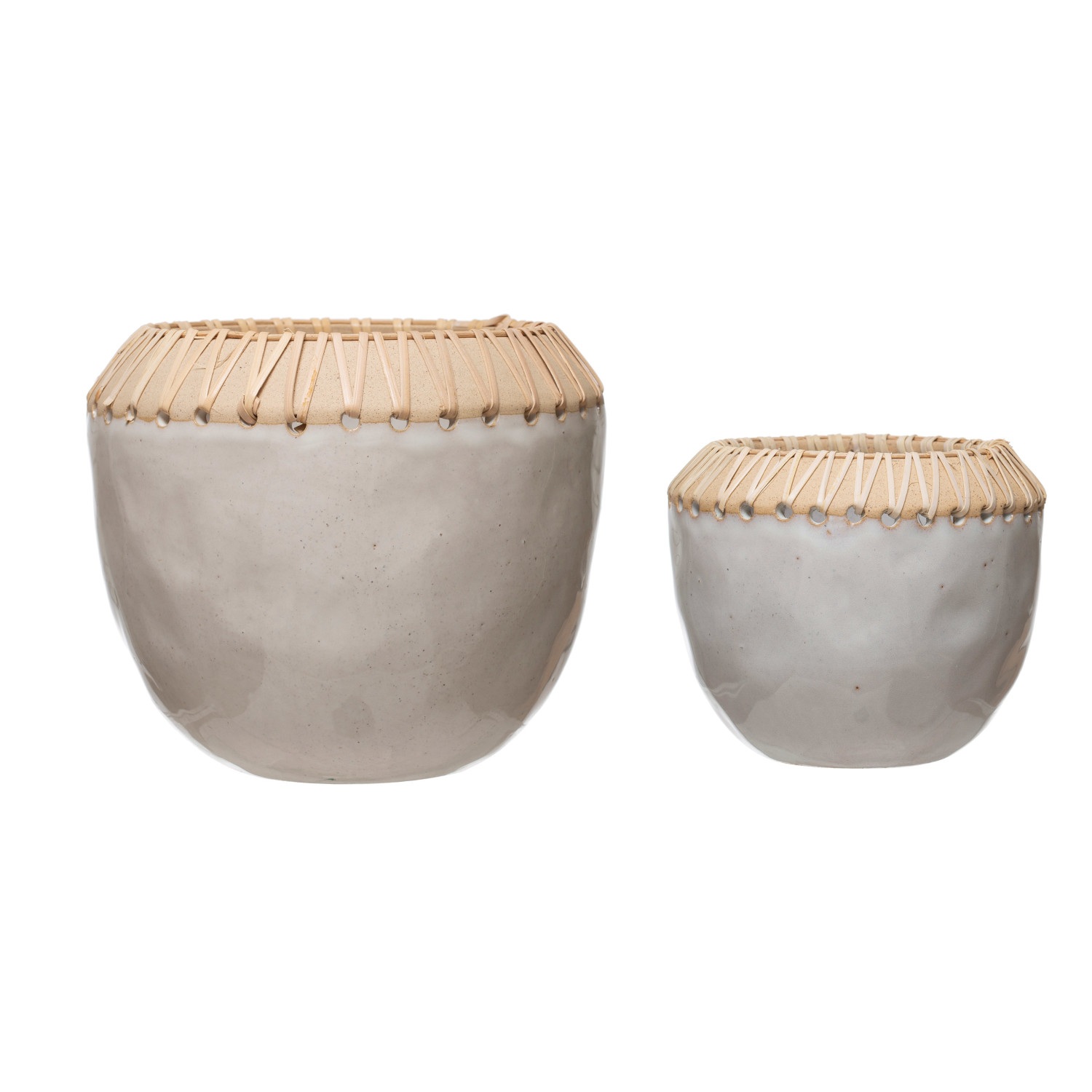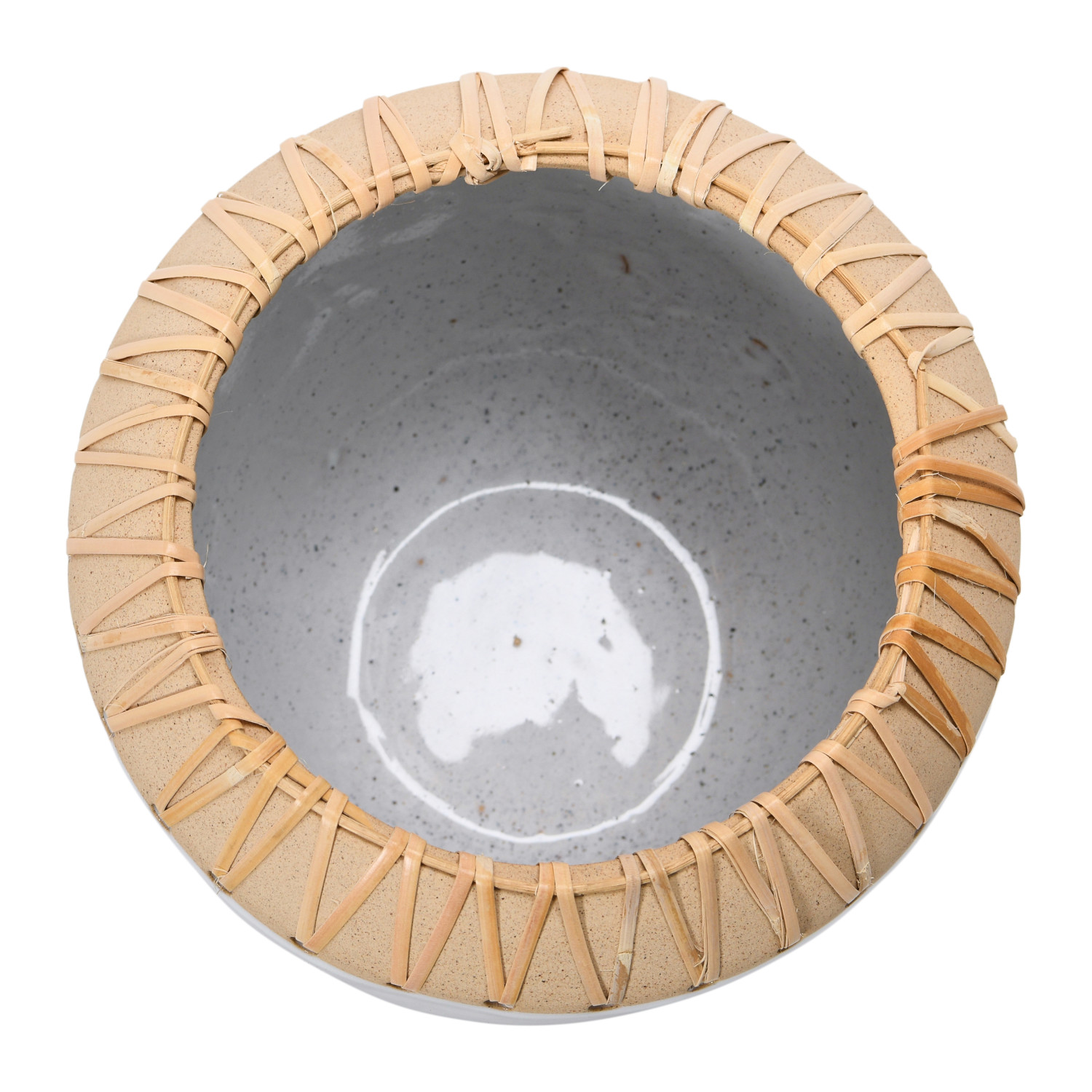 Catalog Name: 7" Round x 6"H Stoneware Planter w/ Rattan Stitching, White & Natural (Holds 5" Pot)