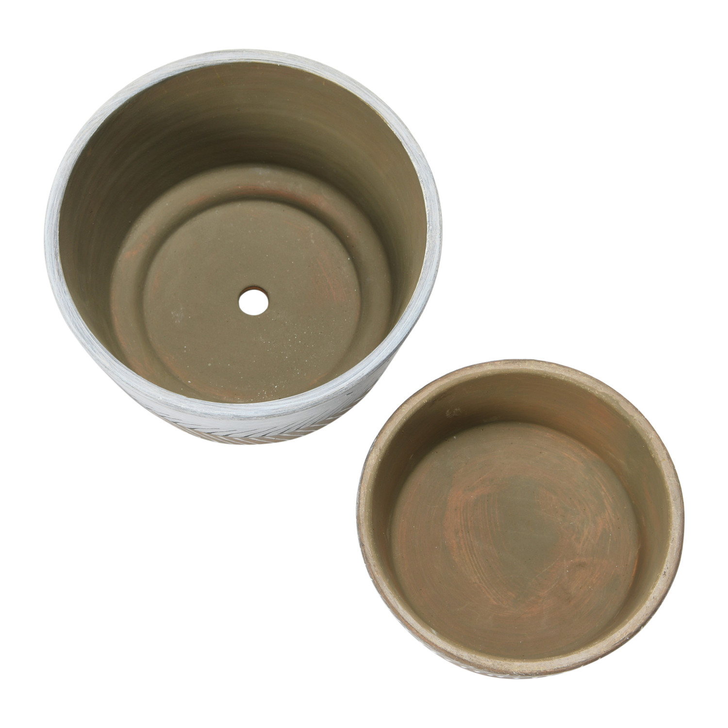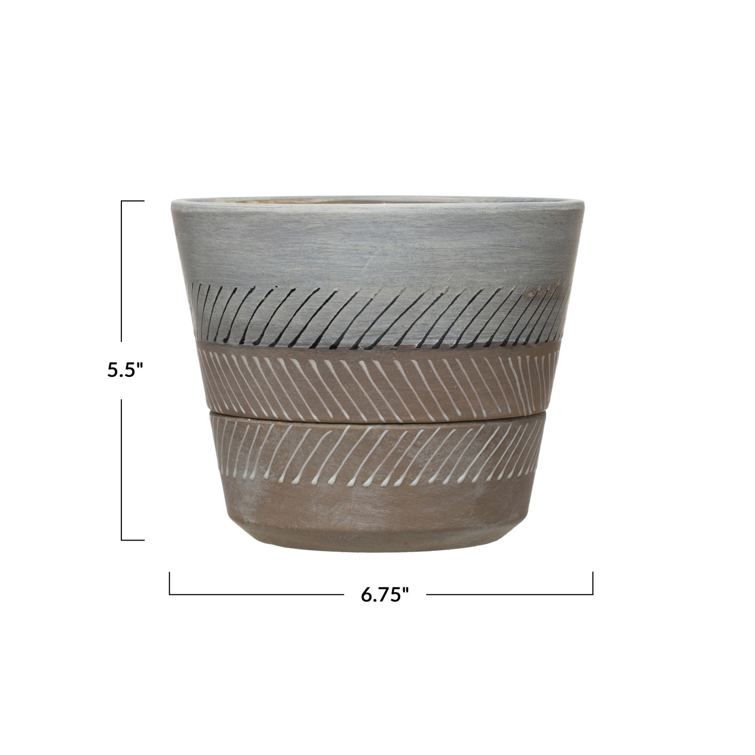 Display plants in a stunning and elegant way with this hand-painted terra-cotta planter with saucer and pattern. This planter is made of high-quality terra-cotta that is porous and breathable. This gives it a natural and earthy appearance that complements any plant. It also has a saucer that catches excess water and prevents spills. It also has drainage holes at the bottom that keeps plants healthy and happy. This planter has a white and grey color scheme that creates a striking contrast and a geometric pattern that adds style and flair to the space. This planter is suitable for any style of home decor, from contemporary to classic, as it has a simple and sleek design that matches any palette. Use it for indoor or outdoor plants, such as succulents, herbs, or flowers. Place it on the windowsill, shelf, table, or porch to create a beautiful and inviting atmosphere in the home. The vase measures 6.75 inches in diameter, and 5.5 inches tall and can hold a 5-inch pot. This hand-painted terra-cotta planter with saucer and pattern is a stunning and elegant way to display plants in the home.