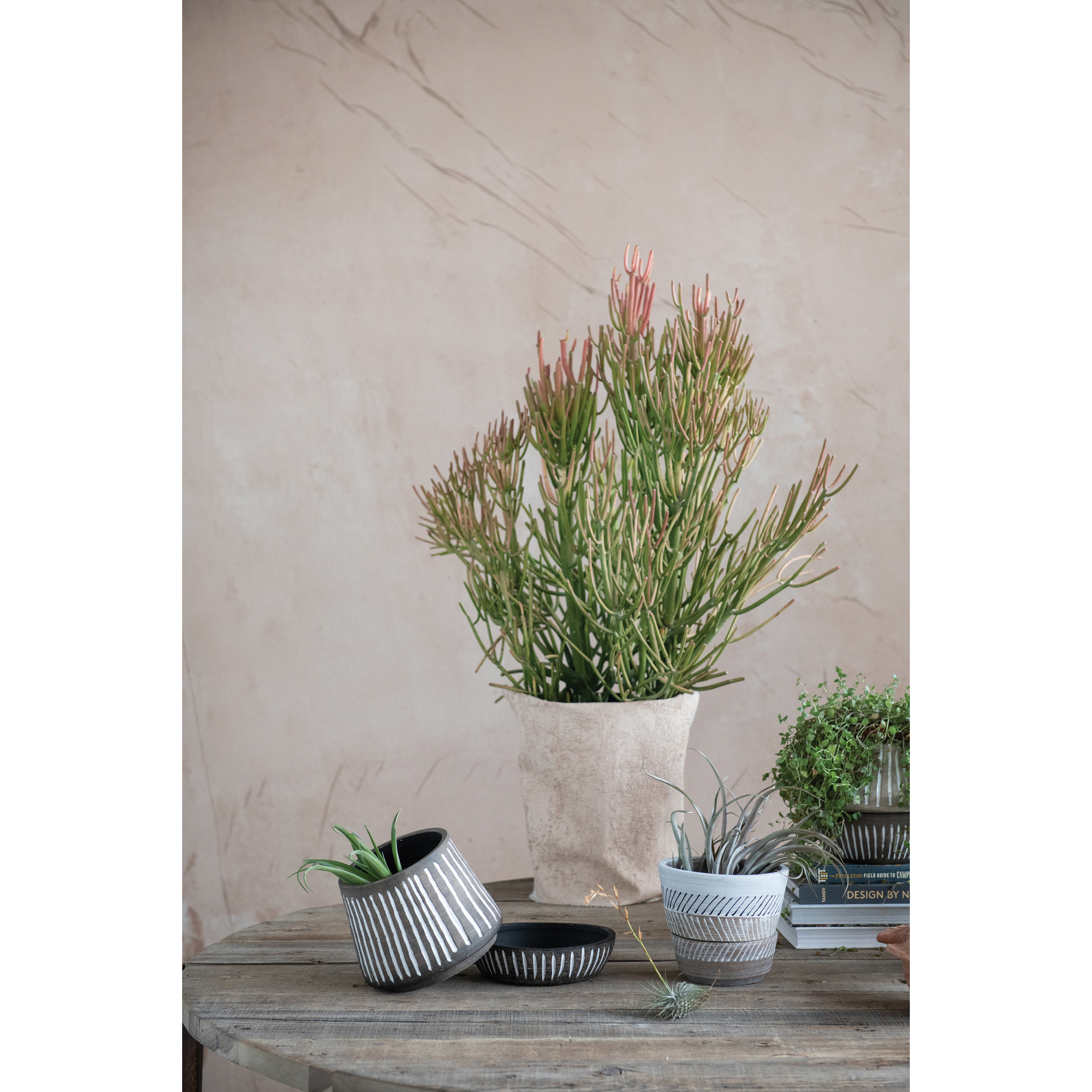 Display plants in a chic and sophisticated way with this hand-painted terra-cotta planter with saucer and debossed lines. This planter is made of high-quality terra-cotta that complements any plant. It also has a saucer that catches excess water and prevents spills to keep plants healthy and happy. This planter has a grey and beige color scheme that creates a neutral and elegant look. It also has a debossed line pattern that adds texture and depth to the space. Use it for indoor or outdoor plants, such as succulents, herbs, or flowers. Place it on the windowsill, shelf, table, or deck to create a beautiful and inviting atmosphere in the home. This planter measures 7.5 inches round and 7 inches tall and can hold a 5-inch pot. This hand-painted terra-cotta planter with saucer and debossed lines is a chic and sophisticated way to display plants in the home.
