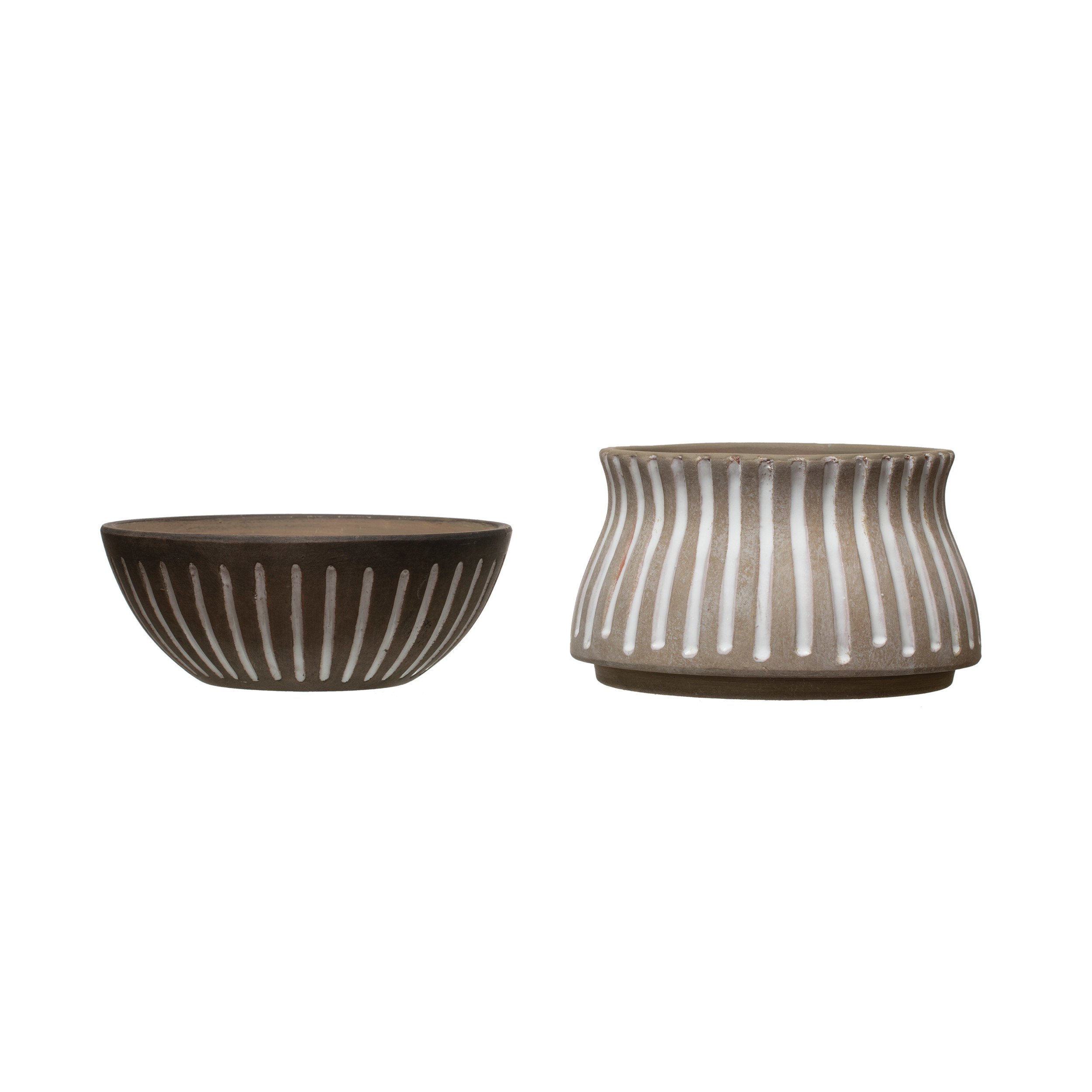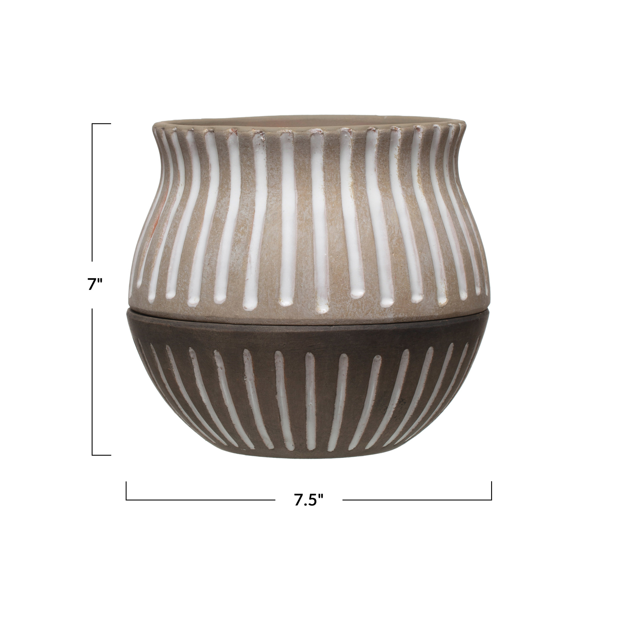 Catalog Name: 7-1/2" Round x 7"H Hand-Painted Terra-cotta Planter w/ Saucer & Debossed Lines, Grey & Beige, Set of 2 (Holds 5" Pot)