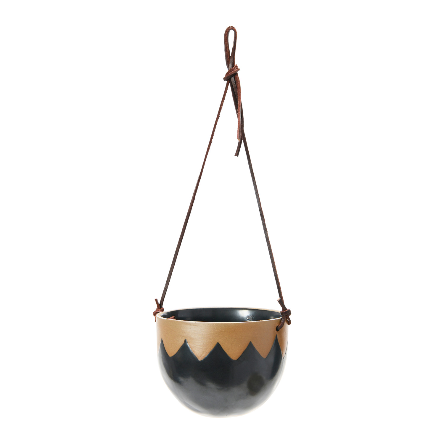 These hanging pots are a beautiful addition to any home, whether indoors or outdoors. Made out of stoneware, these pots come in 4 styles, each featuring a reactive glaze finish. Held up by a leather rope, these effortlessly display any faux or real plants.