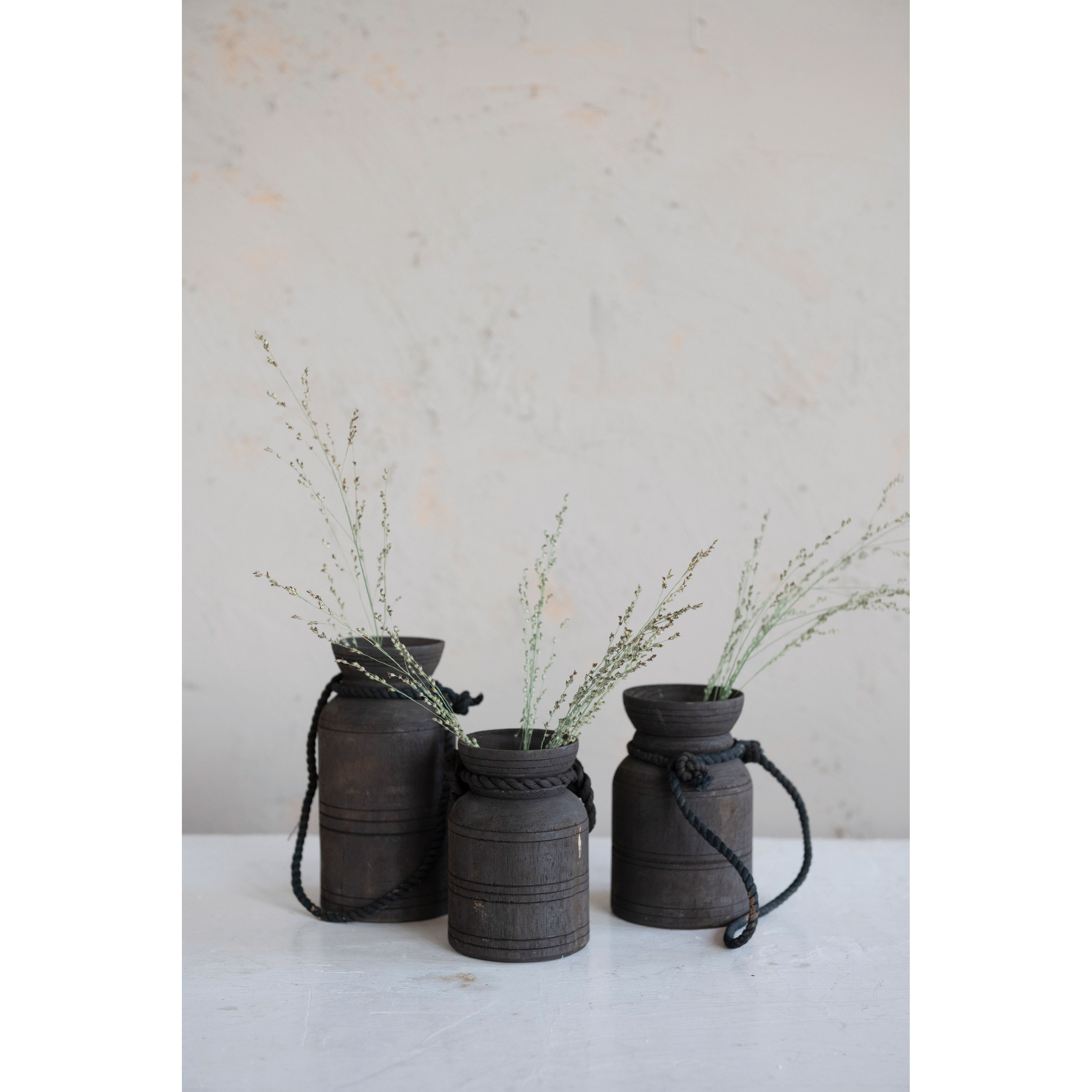 Catalog Name: Approximately 4" Round x 6"H Found Decorative Wood Jug w/ Rope Handle (Each One Will Vary)