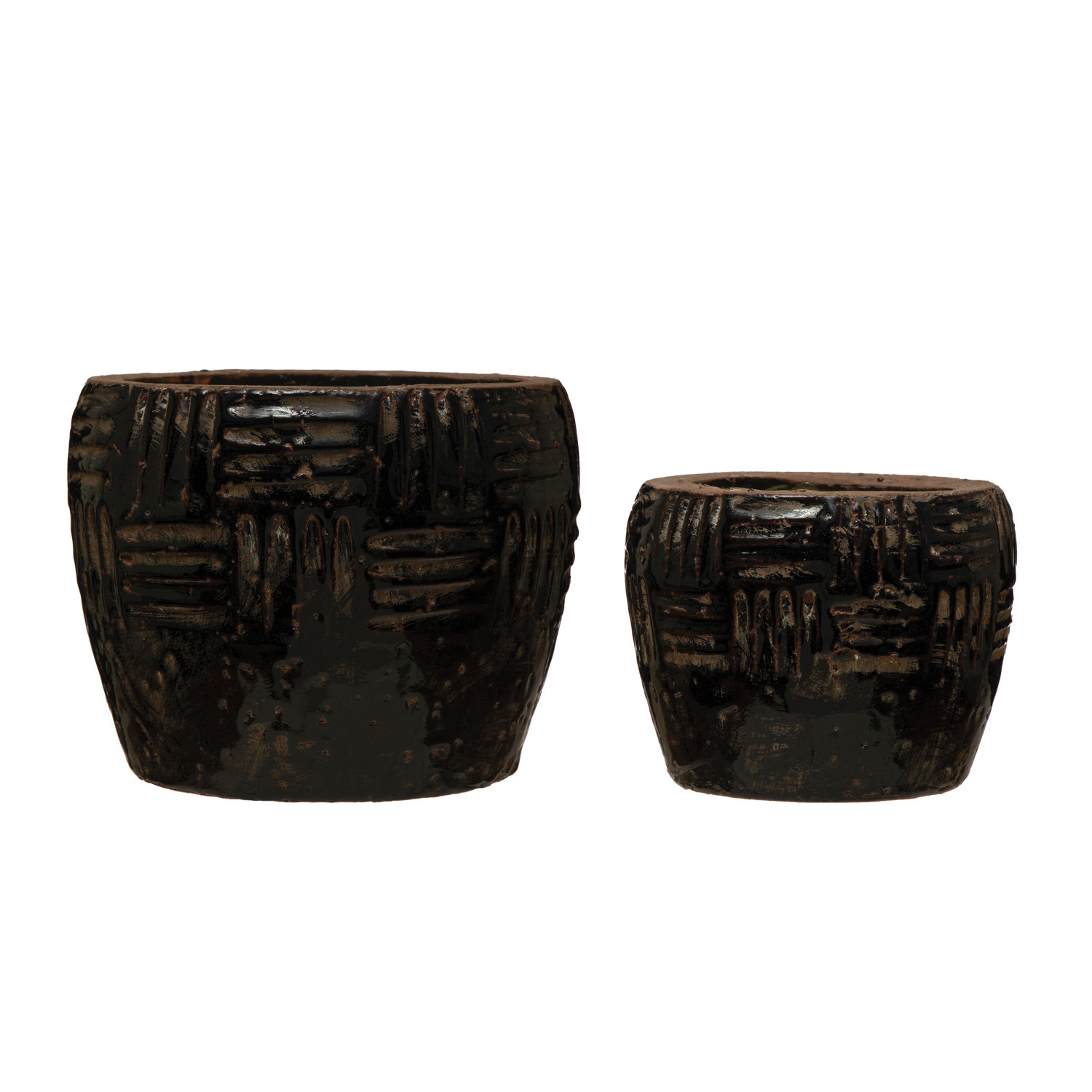 This Embossed Terra-cotta Planter, Crackle Finish, Distressed Black is a gorgeous piece of home décor that can add style and functionality to any space. The planter is made of terra-cotta, a material that is known for its natural and earthy appeal. The planter has an embossed design that creates a textured and elegant impression. The planter has a crackle finish that gives it a distressed and aged look. The planter has a black color that is dark and sophisticated, making it easy to match with any color scheme. The planter is designed to hold a 4-inch pot, making it ideal for displaying small plants or flowers. The planter does not have drainage holes, so it is recommended to use a liner or a saucer to protect the surface underneath. The planter measures 5.5 inches in diameter and 4.25 inches in height, making it a cute and eye-catching addition to any room or surface. This is a perfect choice for anyone who wants to enhance their own space or give it as a gift to someone special. A beautiful terra-cotta planter that features an embossed design and a crackle finish in distressed black. Ideal for adding a touch of rustic and vintage charm to any farmhouse, country, or shabby chic style home décor. Can be used as a vase for artificial flowers, or as a decorative piece on its own. Made of terra-cotta.