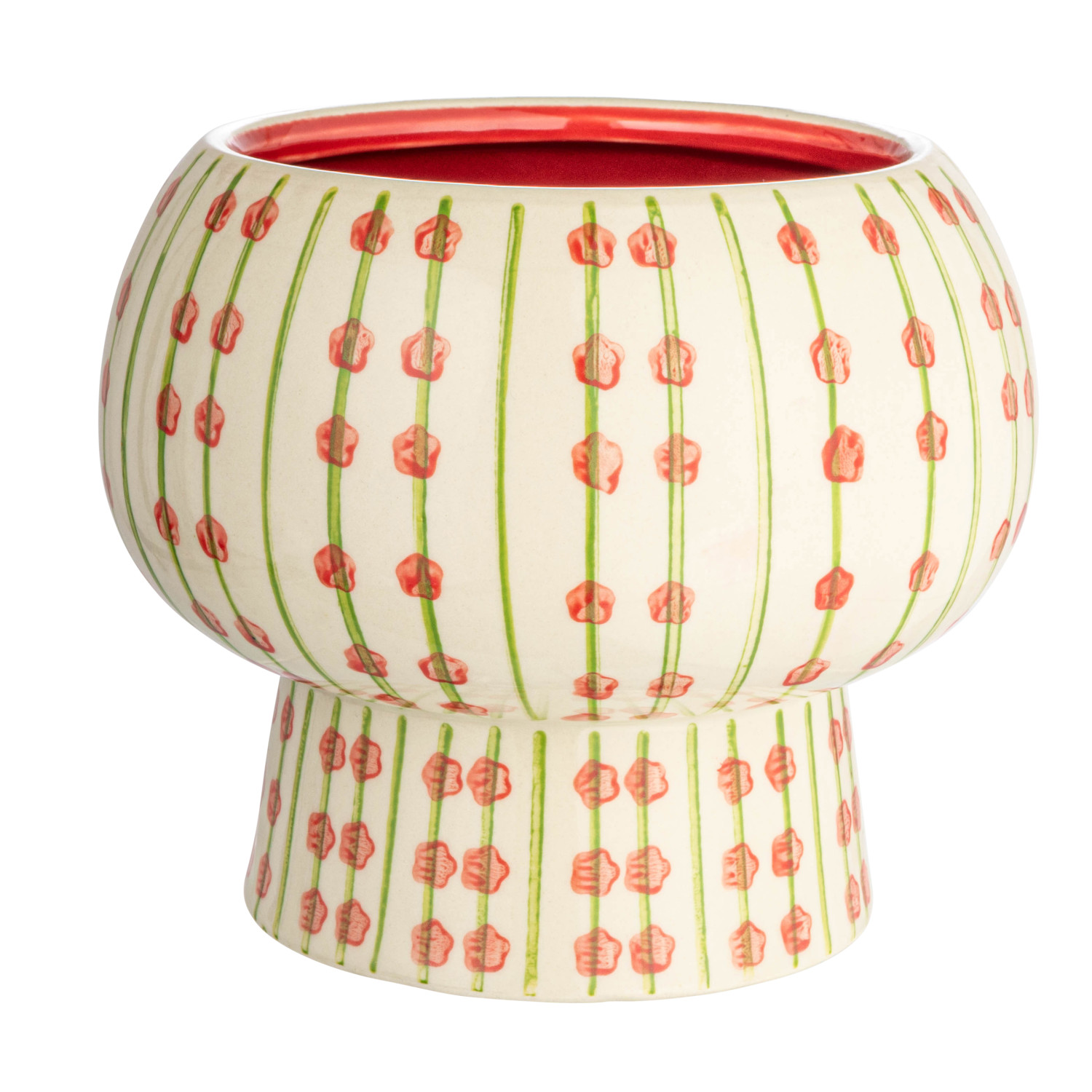 Catalog Name: 6-3/4" Round x 5-1/2"H Hand-Painted Stoneware Planter w/ Pattern, Cream Color, Green & Red