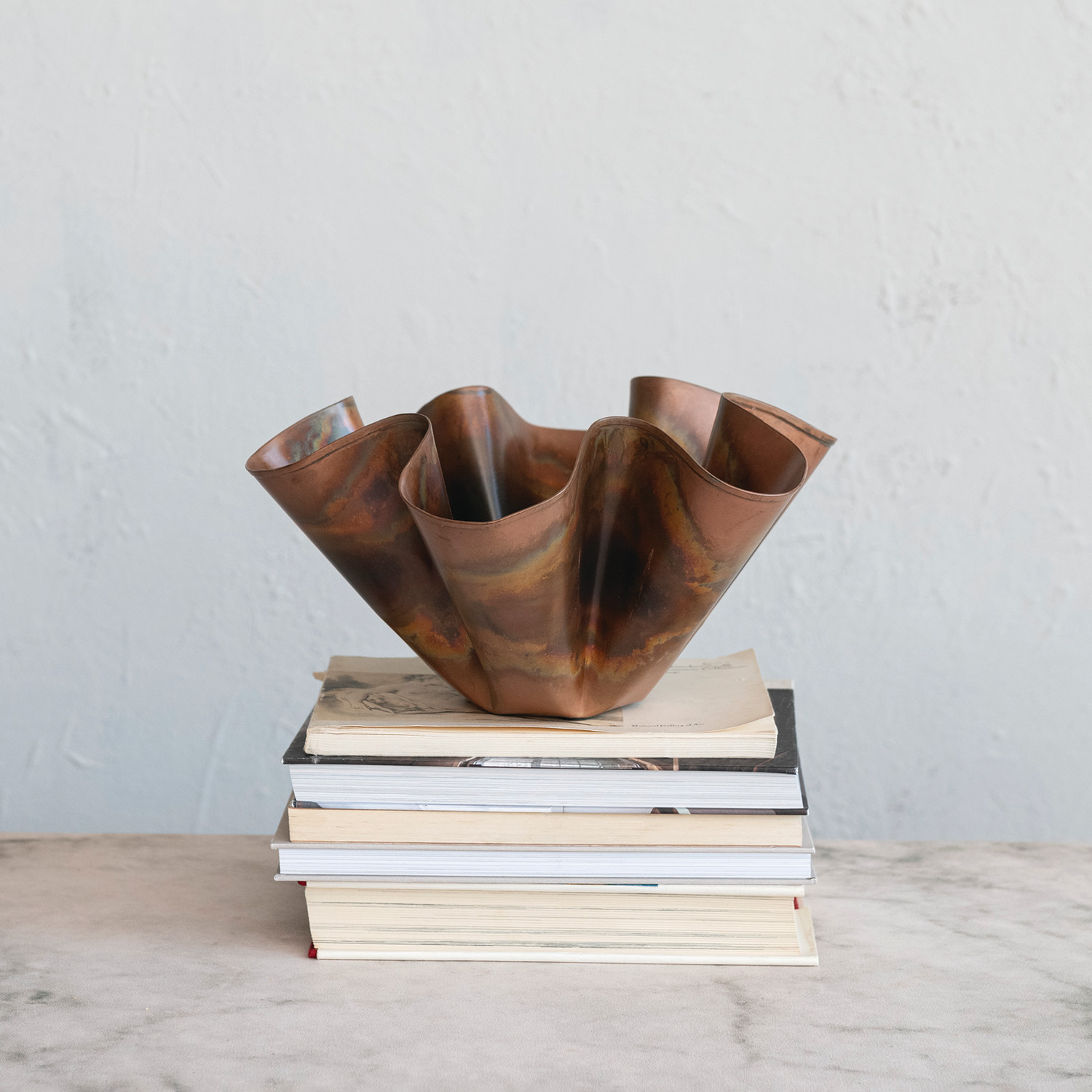 Catalog Name: 14-3/4" Round x 7-3/4"H Decorative Metal Ruffled Bowl, Oxidized Copper Finish