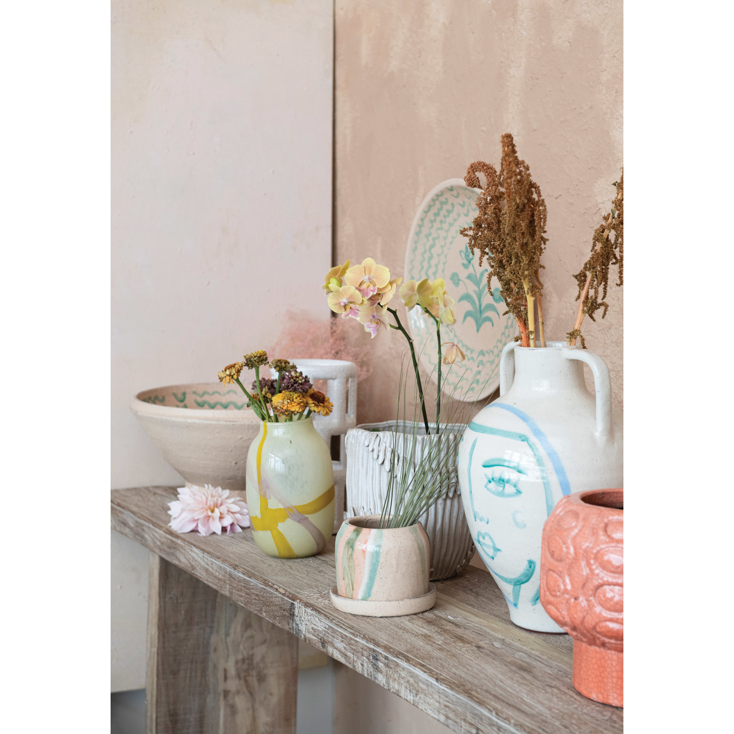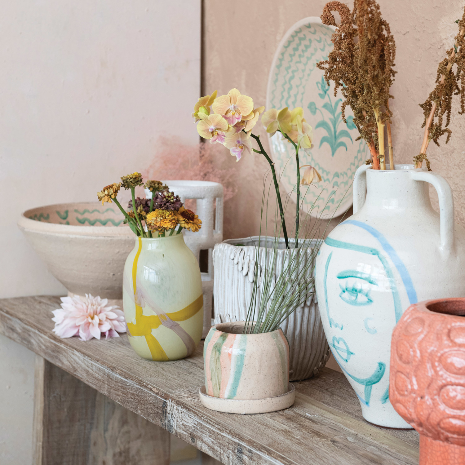 Catalog Name: 6-1/4" Round x 4"H Hand-Painted Terra-cotta Planter w/ Stripes & Saucer, Crackle Glaze, Multi Color, Set of 2 (Holds 6" Pot) (Each One Will Vary)