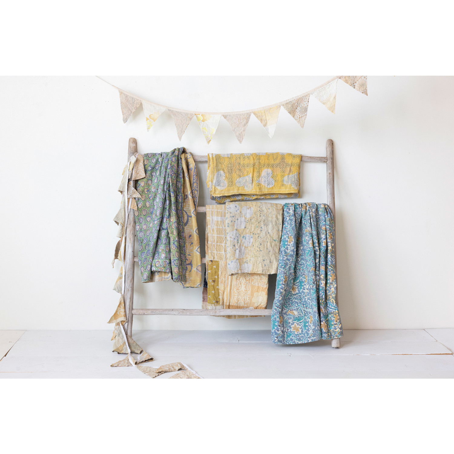 The Cotton Kantha Vintage Sari Fabric Pennant Garland is a delightful and colorful addition to any space. Measuring 72 inches in length and 7 inches in height, it adds a whimsical touch to parties, bedrooms, or even outdoor gatherings. Made from upcycled vintage sari fabric, each pennant tells its own unique story through its vibrant colors and intricate patterns. The soft cotton material drapes gracefully, creating a playful ambiance wherever it is hung. Adorn it with fairy lights or let it stand alone as a statement piece, this garland effortlessly brings cheerfulness and creativity into the surroundings. With its casual aesthetic and bohemian charm, this is sure to be an eye-catching item that sparks conversations among guests and leaves a lasting impression.