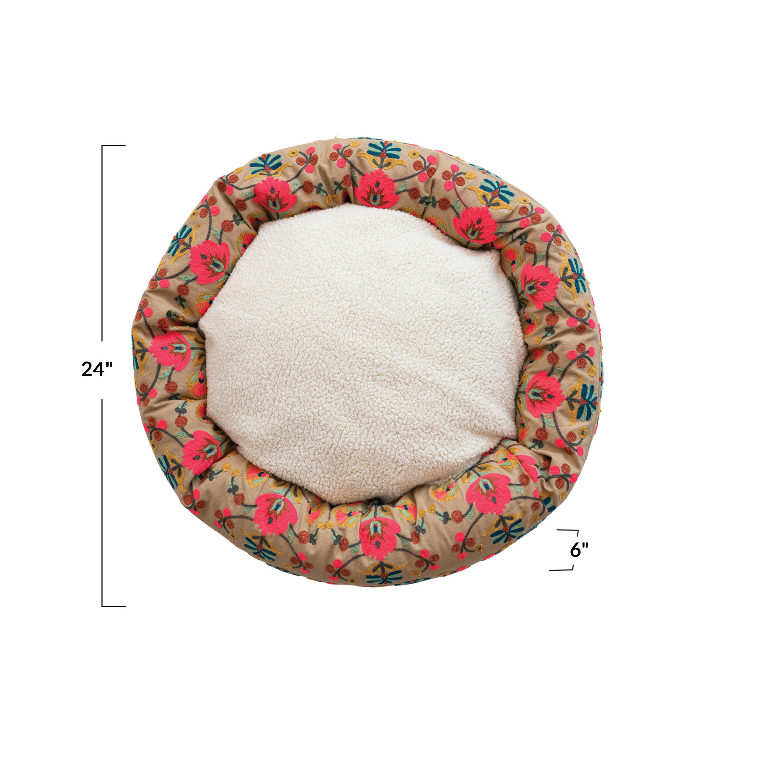 Catalog Name: 24" Round x 6"H Cotton Embroidered & Sherpa Pet Bed w/ Pattern & Washable Cover, Multi Color