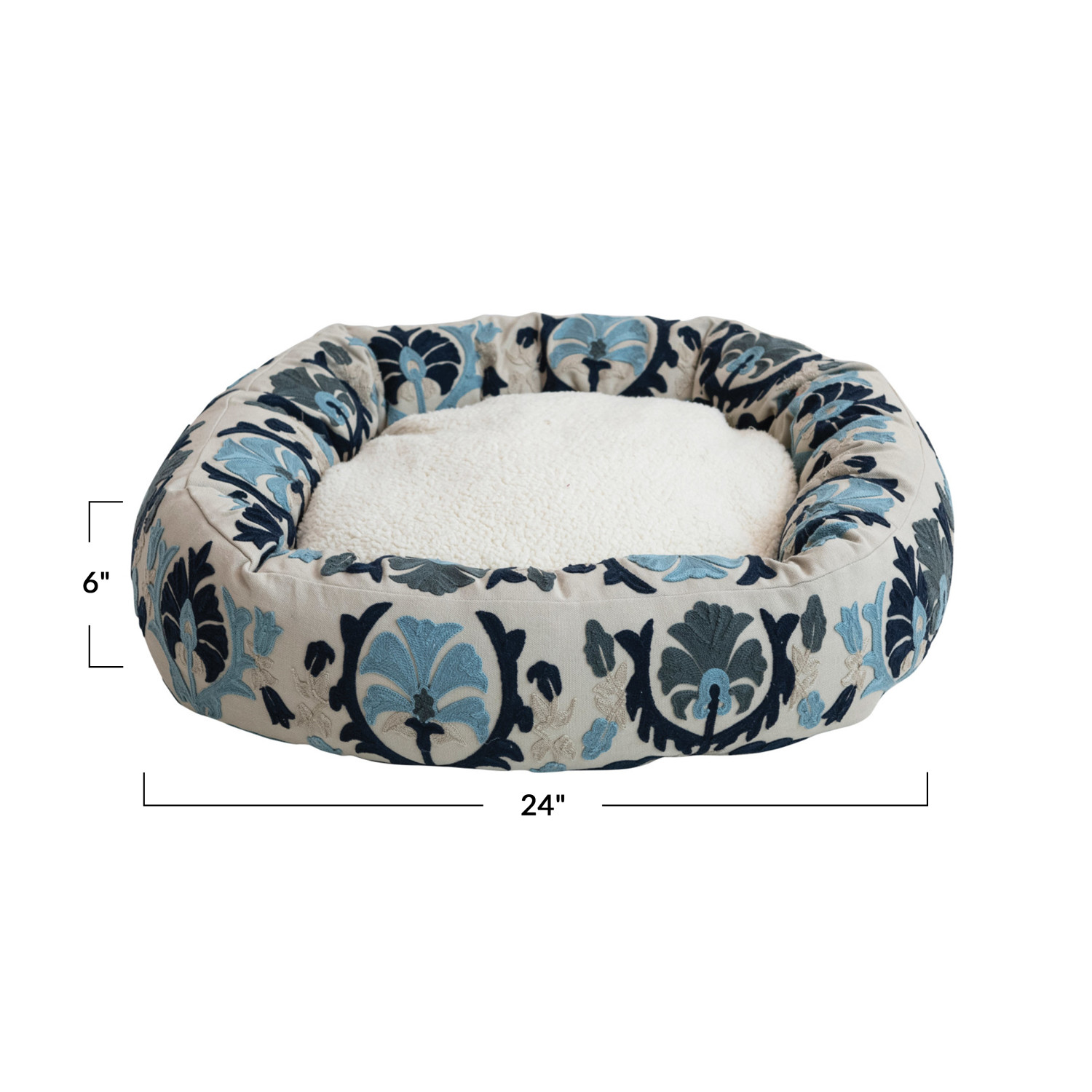 Catalog Name: 24" Round x 6"H Cotton Embroidered & Sherpa Pet Bed w/ Pattern & Washable Cover, Natural, Blue & Grey
