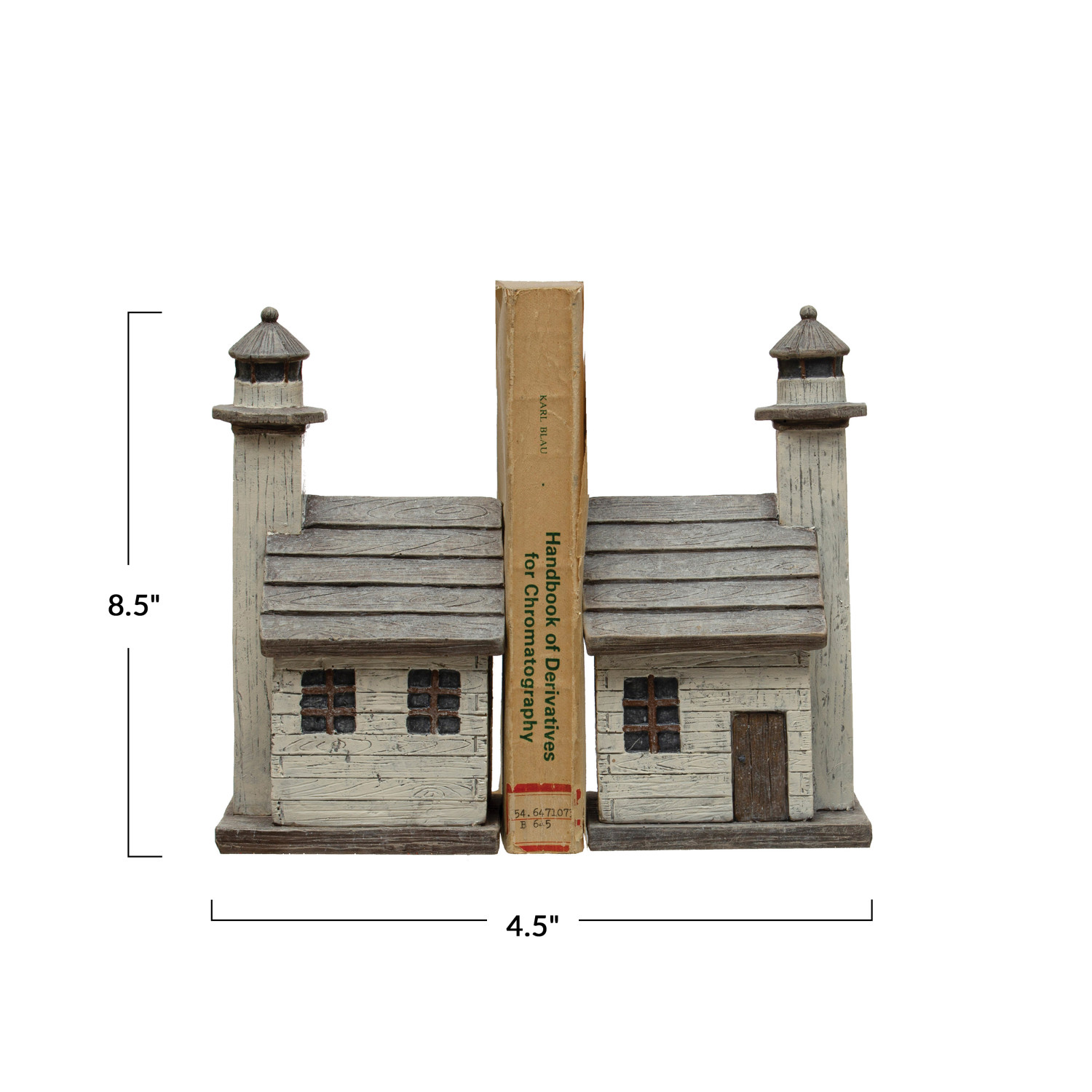 our artfully crafted bookends showcase a wide array of natural materials, imaginative silhouettes, and versatile hues designed to add a hint of creativity to a shelf cape. Instantly transform a bookshelf or mantelpiece into a thoughtfully curated display by exploring a vast array of bookends that feature everything from animal silhouettes to abstract sculptures. Choose from a wide variety of eye-catching materials from marble and wood to glass and iron, and styles from mid-century modern and farmhouse to boho and glam. Add a touch of shimmer or rusticity to a home office, living room, or bedroom reading nook for the ultimate fashionable and storied display. This coastal-inspired set of bookends showcases the silhouette of a seaside lighthouse in a distressed finish. Display in a living space of any style from coastal to transitional. Add a touch of personal style to a mantelpiece or shelfscape with this set of bookends. Made from resin and stone powder.