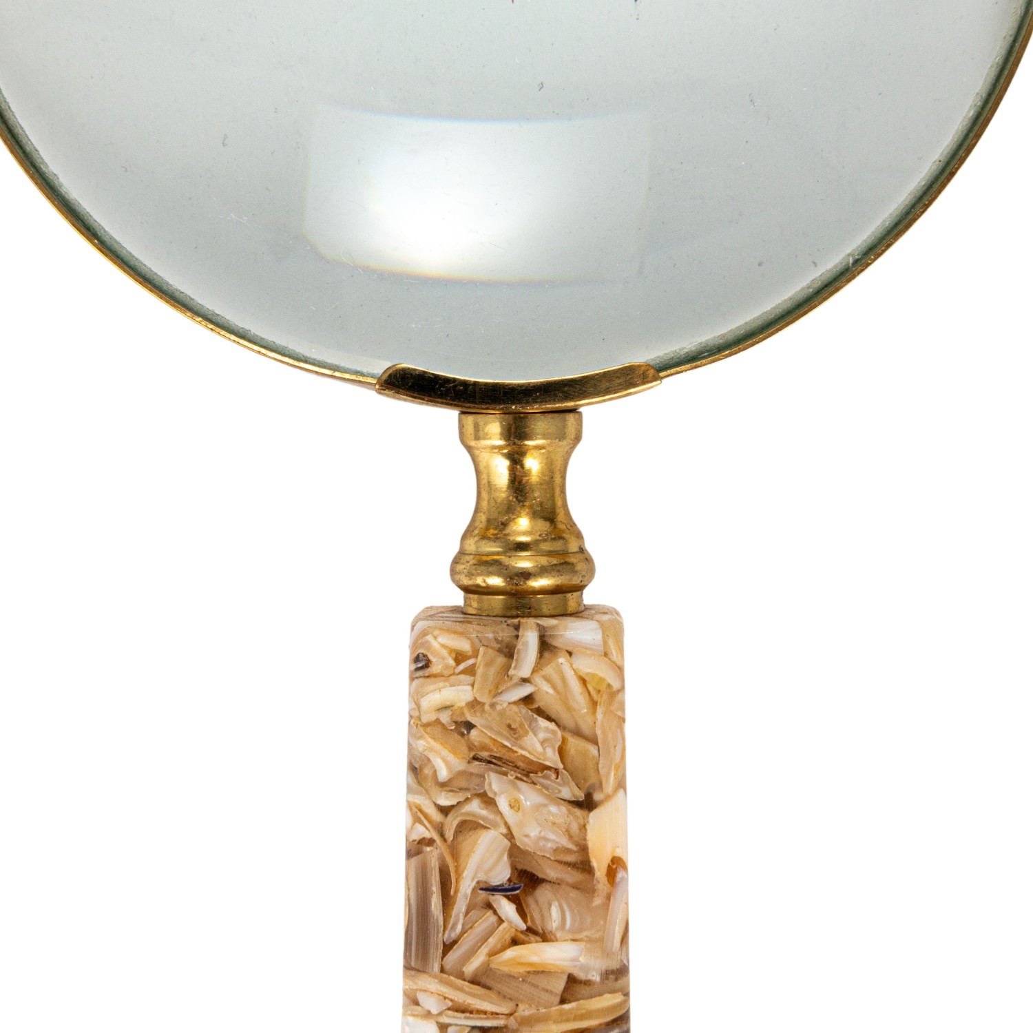 Catalog Name: 9"L x 4"W Mother of Pearl & Resin Magnifying Glass, Brass Finish