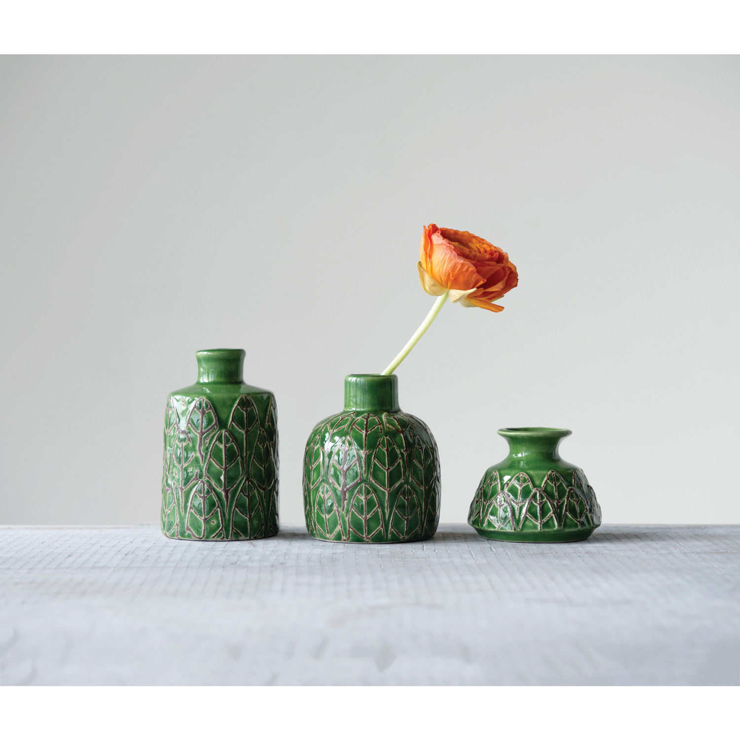 Catalog Name: 4-1/2"H, 3-3/4"H & 2-1/4"H Embossed Stoneware Vases, Green, Set of 3