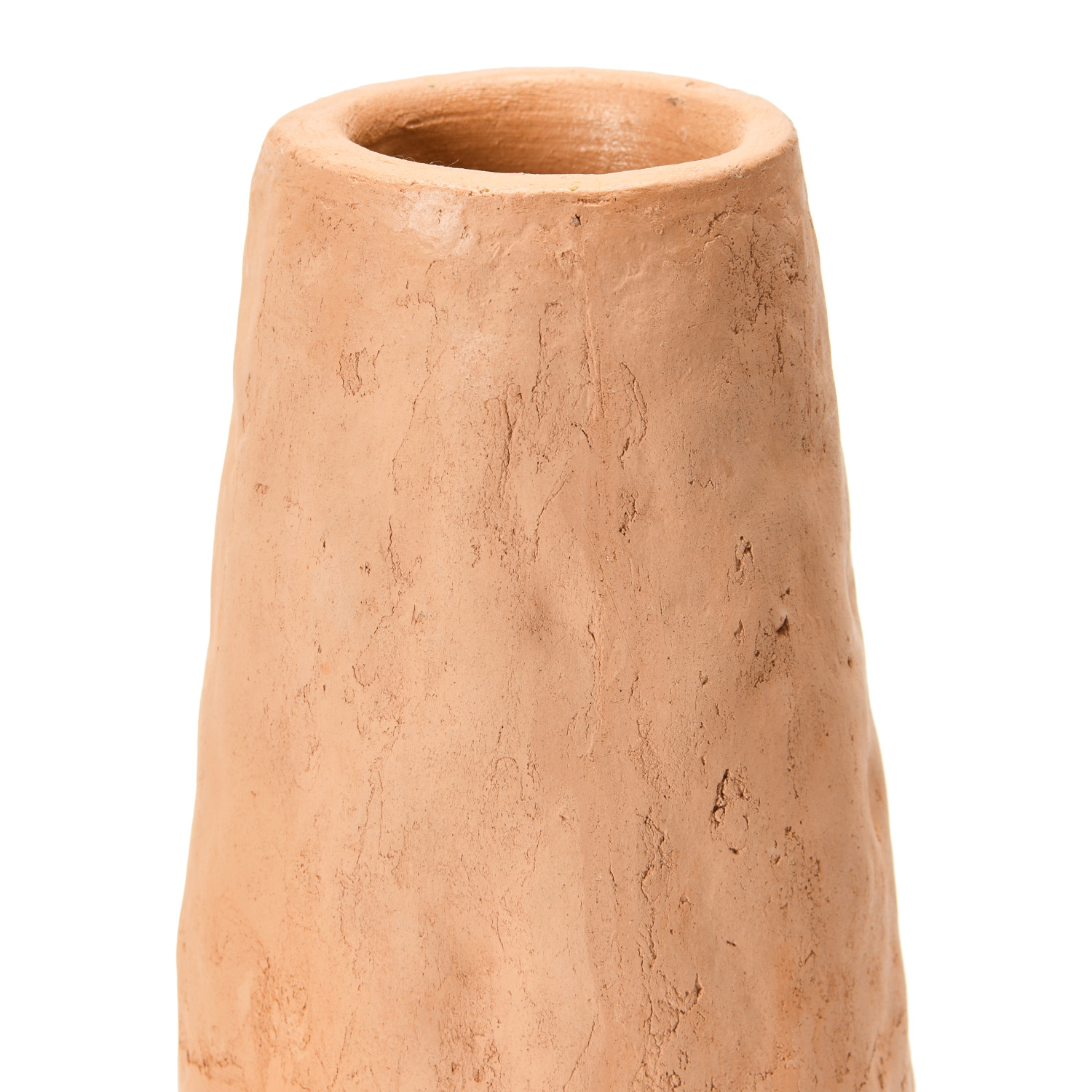 This vase is a beautiful way to display faux or real florals. Made out of terracotta, this vase has a beautiful terracotta color and organic shape. This vase looks great on table tops and shelves, and displays any real or faux florals or stems in a beautiful way.