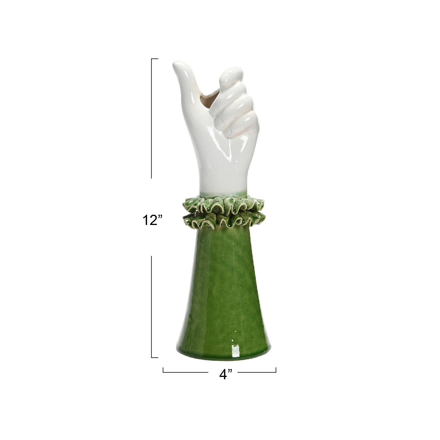 This unique and whimsical vase is shaped like a hand wearing a ruffled shirt sleeve, holding a stem of flower. The vase does not have drainage holes, so it can be used as a decorative piece or a container for artificial flowers.
