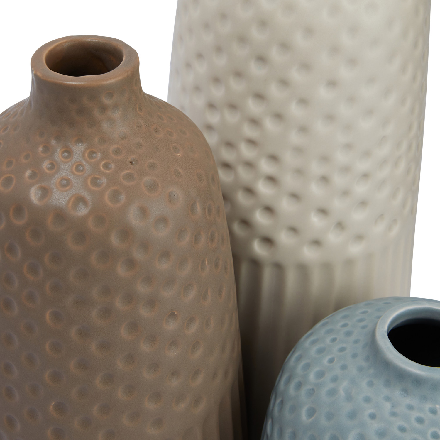 Catalog Name: 4" Round x 10"H, 4" Round x 8-1/2"H & 4" Round x 4-3/4"H Debossed Stoneware Vases, Matte Multi Color, Set of 3