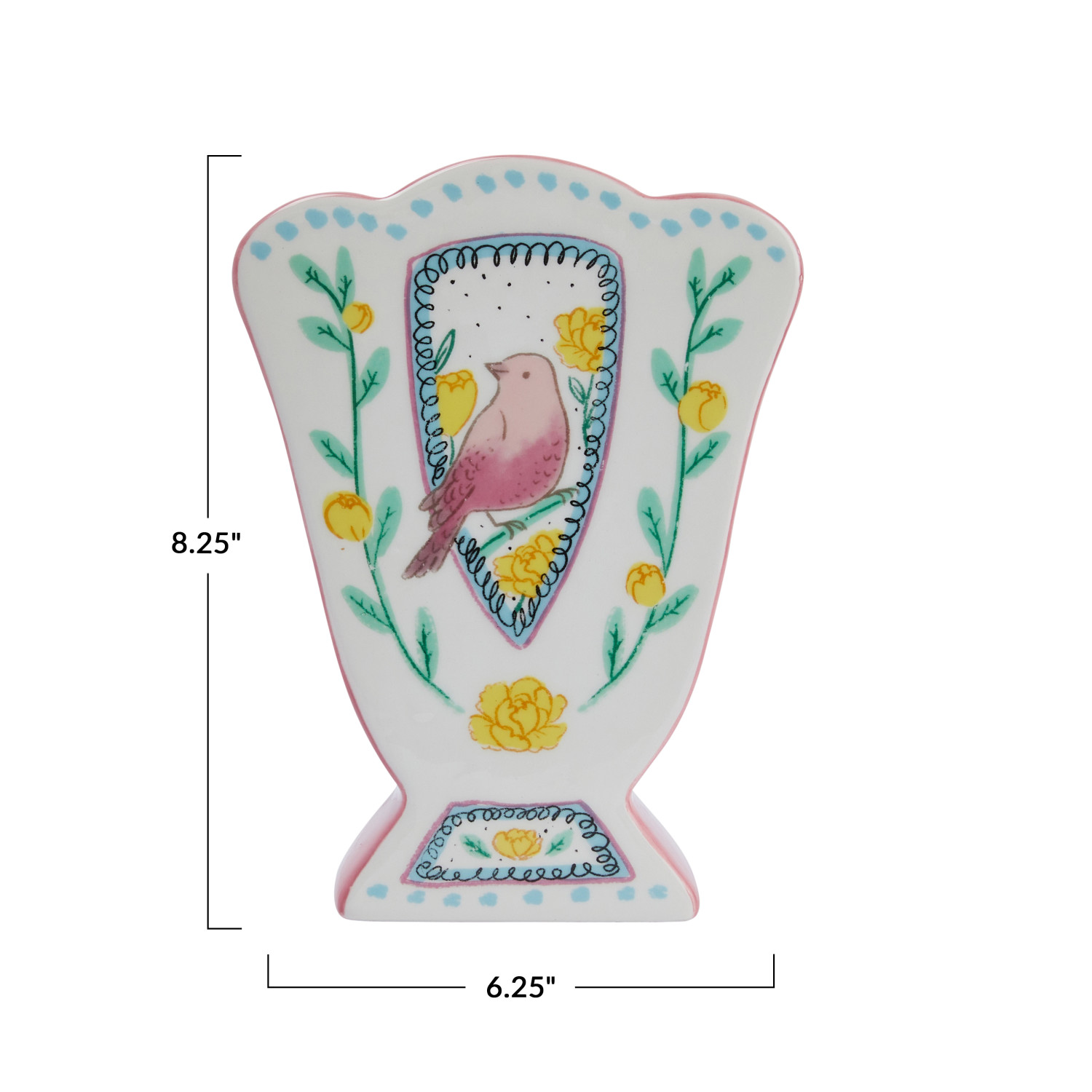 Catalog Name: 6-1/4"L x 3-1/4"W x 8-1/4"H Ceramic Fan Shaped Scalloped Vase w/ Birds, Multi Color