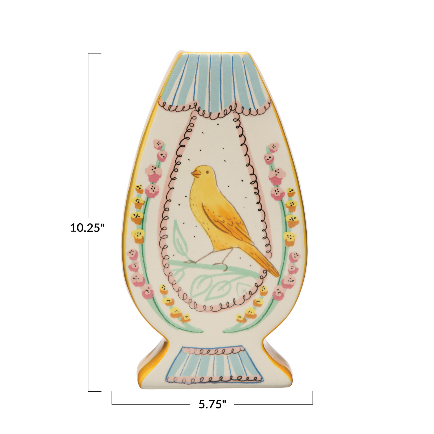 This delightful vase adds fun and personality to any home. The ceramic vase features ceramic bird paint that sits on the rim of the vase and adds some charm and whimsy to the design. The vase also has a multi-color design that showcases various colors such as green, pink, white, blue, and yellow. The vase does not have drainage holes, making it versatile for different uses. It can be used as a decorative vase for flowers, branches, or greenery. The vase is made of dolomite, a type of ceramic that is smooth, glossy, and durable. The vase measures 5.5 inches in length, 3.25 inches in width, and 10 inches in height, with a narrow opening that can accommodate various floral arrangements. Whether displayed on a mantel, shelf, table, or counter, this vase enhances the décor with its fun and personality. A delightful vase that features a ceramic bird paint and a multi color design. Suitable for adding some fun and personality to the cottage, vintage, or shabby chic home décor. It can be used as a decorative vase for flowers, branches, or greenery. Made of dolomite.