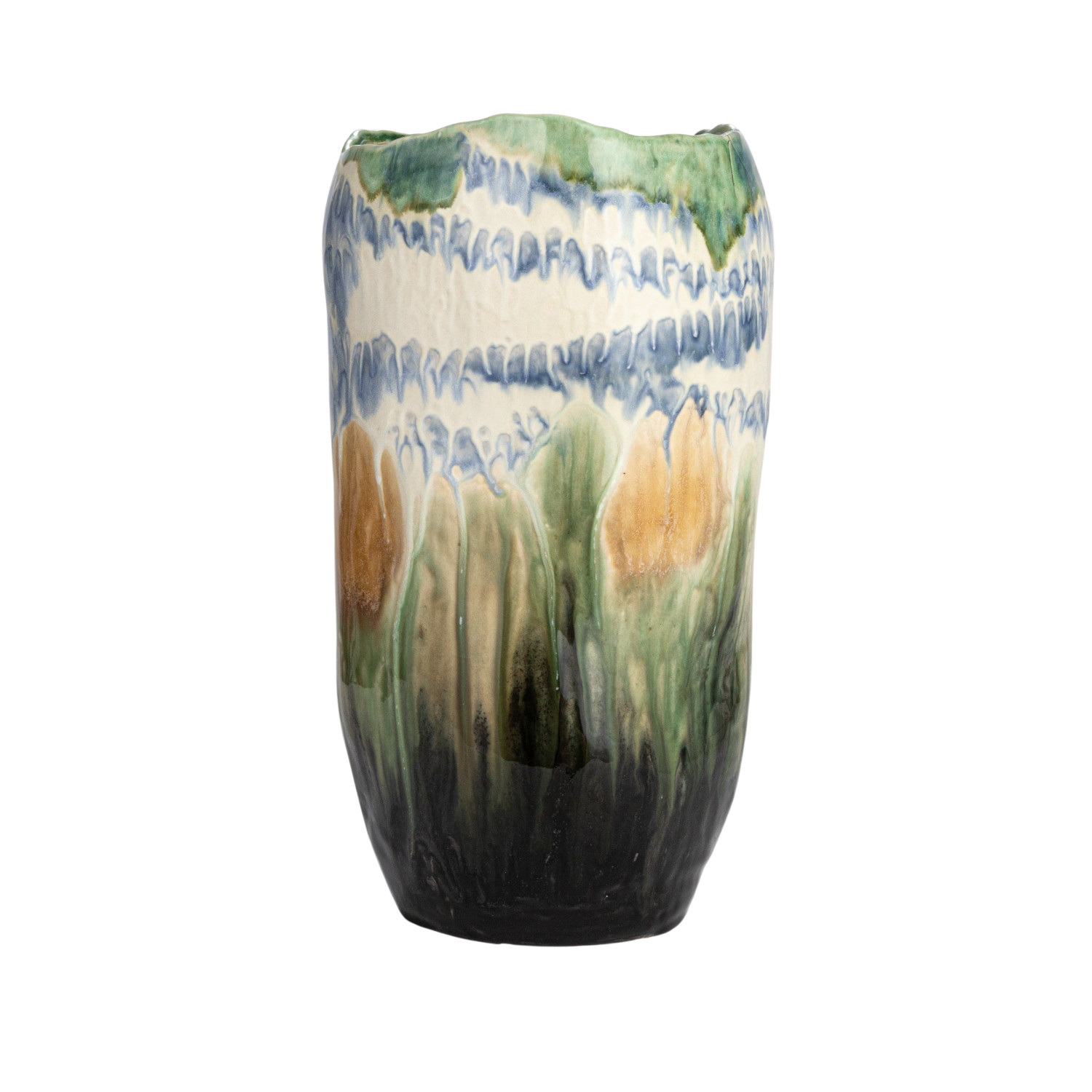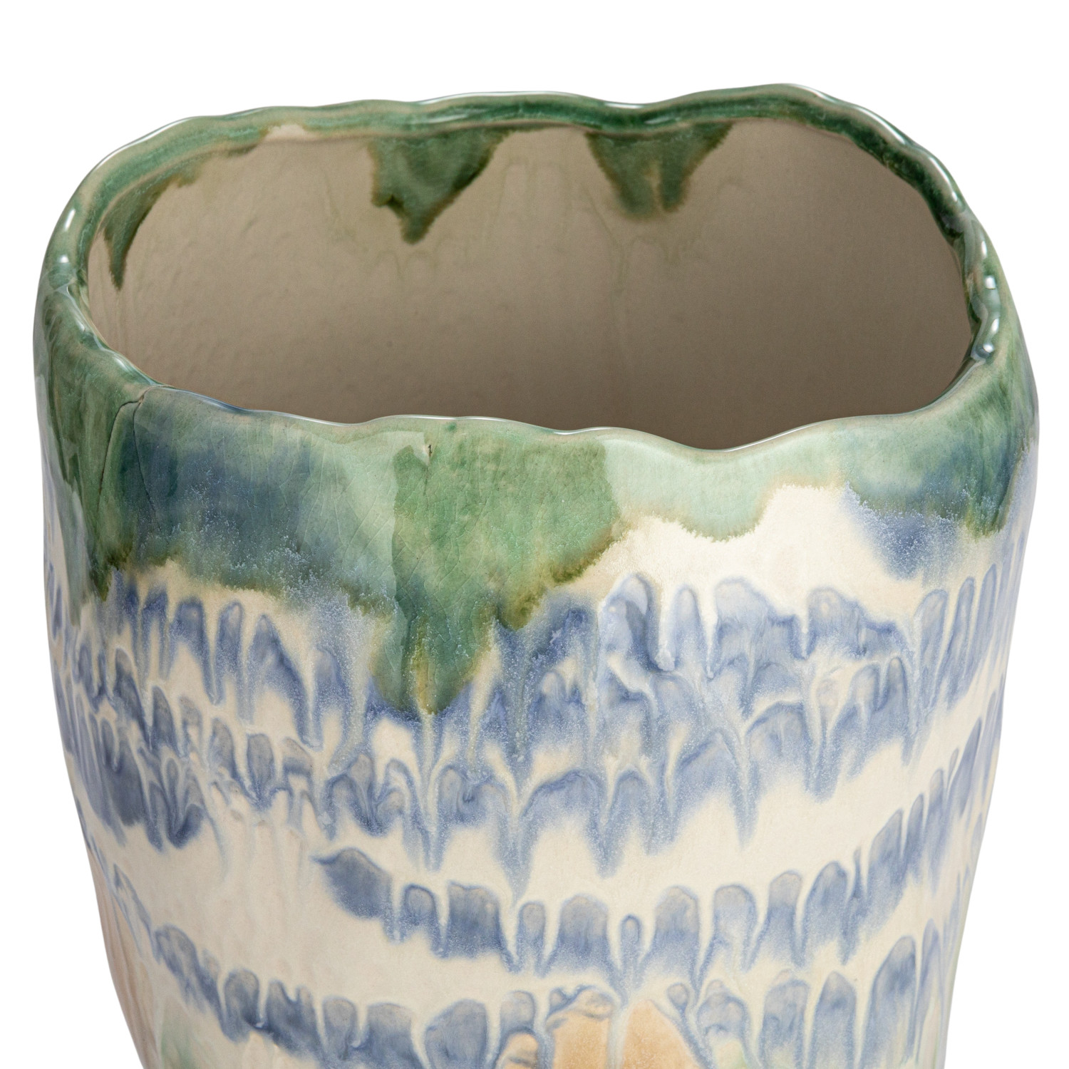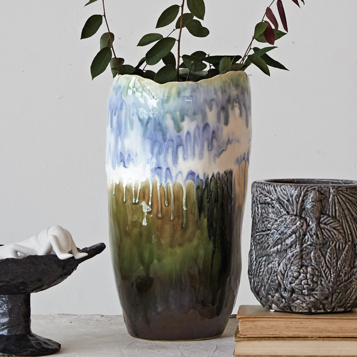 Catalog Name: 7-3/4" Round x 14-1/2"H Stoneware Vase w/ Design, Reactive Glaze, Multi Color (Each One Will Vary)